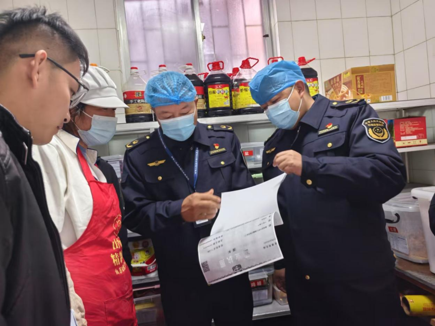 检查由县市场监管局局长施汝宏带领执法人员,采取“抽查+监管”模式,重点对大姚县第一中学督查发现问题清单整改落实情况进行“回头看”抽查检查,针对食堂环境卫生、餐饮具清洗消毒、食品采购、食品储存、加工制作、食品留样等问题的整改情况进行抽查,对索证索票、进货查验、从业人员健康管理等情况进行现场检查。对不符合储存条件的食品、食品留样不规范、冷藏冷冻设备条件不达标、餐饮具清洗消毒不合规等问题现场要求立行立改。共检查出不规范问题7个。