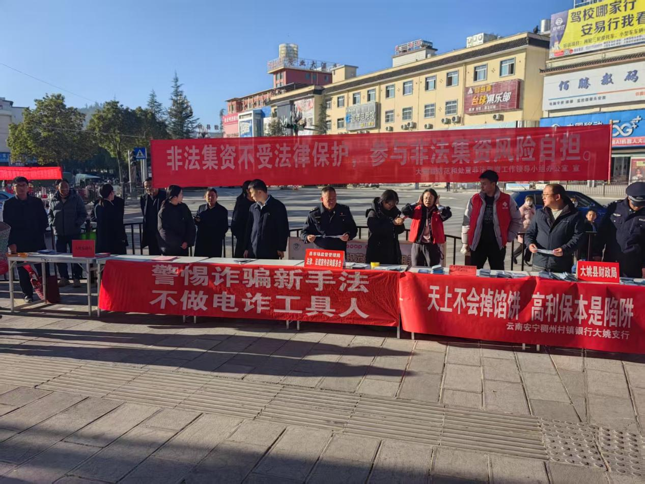 岁末年初,为有效提高广大群众警惕性,增强风险防范意识和识别能力,远离非法集资,大姚县充分利用春节“万众返乡、万家团聚”的有利时机,县处非办牵头,县市管、公安、金融监管局及各商业银行参与,在县城开展“远离非法集资,警惕高利诱惑”主题宣传活动。