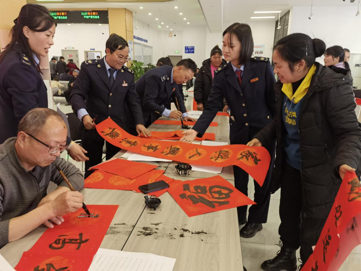 1月20日下午,大姚县政务服务中心和县税务局联合开展“翰墨书祥瑞,挥春送祝福”写春联送政策活动,用最具“年味儿”的方式,向前来办事的群众送上不一样的新春祝福。