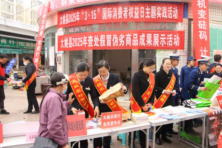 ——多部门联合宣传。2025年3月14日上午,大姚县市场监督管理局牵头县农业农村局、县文化和旅游局、县烟草专卖局、县金融监管局等县打击侵犯知识产权和制售假冒伪劣商品领导小组部分成员单位,在人员集中的永盛农贸市场集中开展宣传。通过悬挂宣传标语、展示宣传展板、发放宣传资料、解答群众咨询等各种形式,广泛宣传消费维权相关的法律法规,现场解答和受理消费者咨询、投诉,提升经营者的诚信经营意识和消费者维权意识。