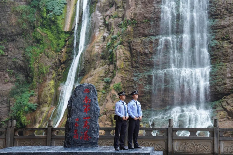 三潭瀑布、石羊古镇景区内,欢快的氛围中,安全提醒声格外温暖。“各位游客朋友们,观赏景色时要注意脚下安全,保管好自己的随身物品,看管好小朋友!”执勤民辅警们穿梭在人群中用亲切的话语为游客们送上关怀,确保能第一时间应对游客迷路、受伤、遗失物品等各类警情,及时满足游客需求,以全时空守护让群众感受到实实在在的安全感。同时,执勤警力以群众“看得见、容易懂、记得住”的方式,开展针对性宣传教育,切实提升群众识骗防骗和安全防范意识。