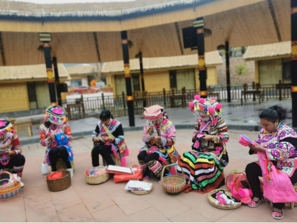 她们三五成群聚在活动室,用各式各样颜色的丝线在自己喜欢的头巾、腰带、衣襟、袖沿中绣上精美的花纹图案,具有较强的民族特色,别具风格。她们互相学习刺绣的特点、刺绣方法和刺绣制作的色彩搭配。她们当场画花刺绣、手绢上钩花,一展彝族妇女的巧手。只见妇女们穿针引线,“一针一世界”,彩线飞舞......这一双双巧手平时也在为家庭创收呢。