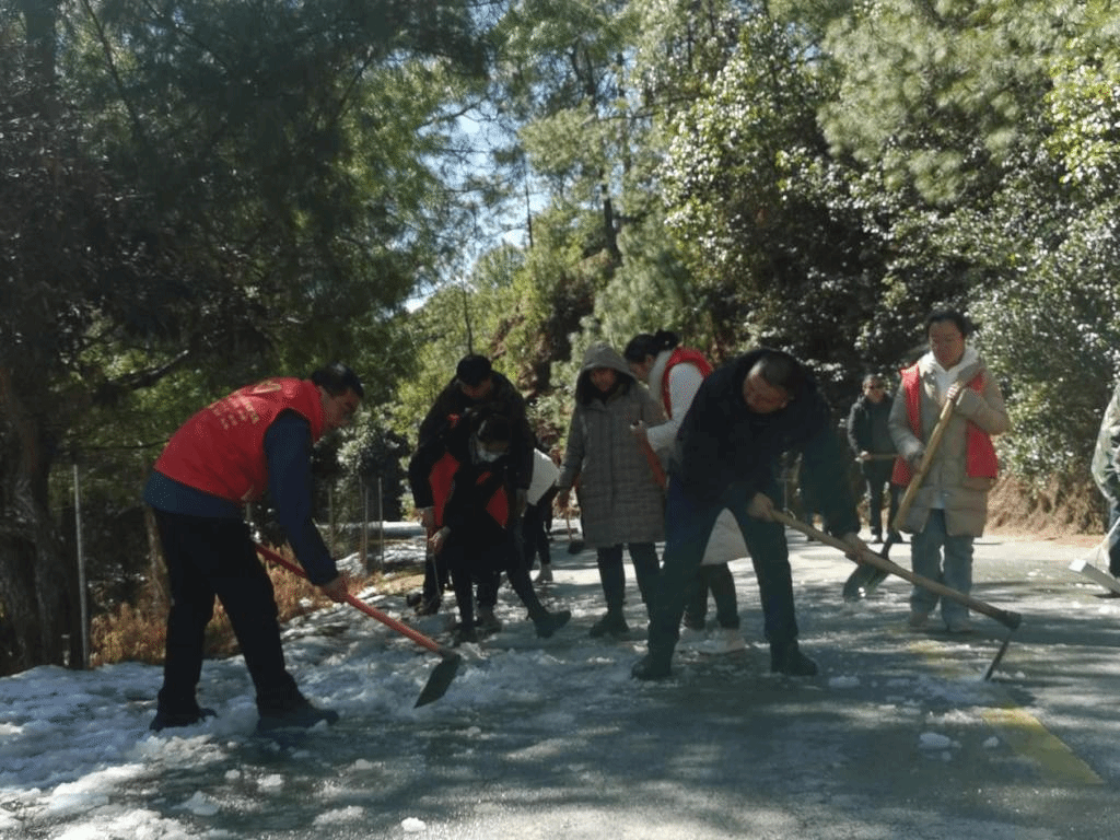 走进楚雄州大姚县昙华乡,银装素裹,云雾缭绕。一路可见志愿者们正在道路上清雪除冰,他们或撒盐、或清扫、或铲雪,干劲十足。