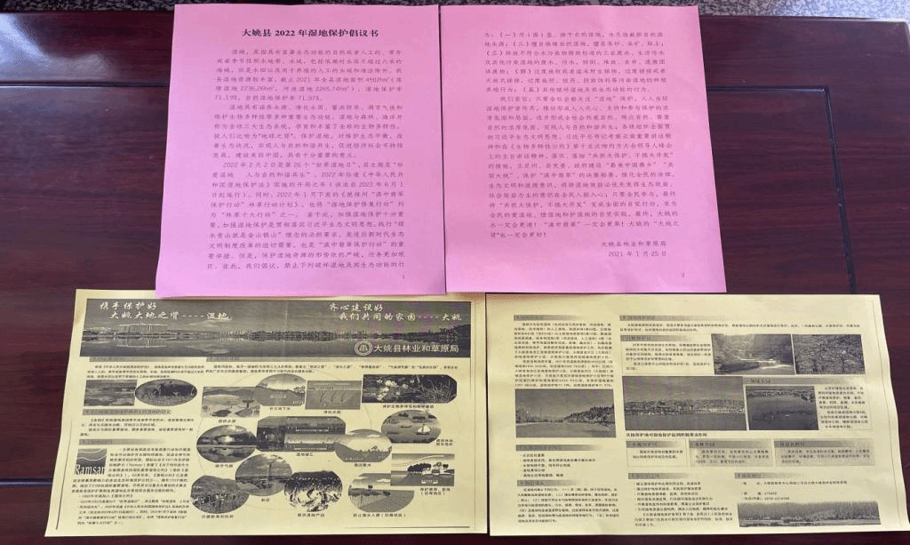 此次宣传活动通过悬挂横幅、摆放宣传展板、发放宣传材料等形式,向群众宣传讲解即将于2022年6月1日生效的《中华人民共和国湿地保护法》《楚雄州“滇中翡翠”保护行动林草行动计划》等法律法规,阐明国家生态文明建设、绿色发展要义,营造“齐抓湿地大保护,共享山水好风光”的湿地保护良好社会氛围。并向广大群众发放《大姚县2022年湿地保护倡议书》《携手保护好大姚大地之肾—湿地 齐心建设好我们共同的家园—大姚》宣传画册。此次活动共悬挂横幅1条、摆放展板2块、发放倡议书、宣传画册400余份。