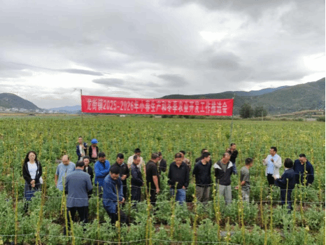 秋日的龙街镇,田间地头依然生机盎然。在仓屯村委会鲁口场小组的烟田套种示范基地,曾经采收完毕的烤烟地里,嫩绿的蚕豆苗整齐排列,洁白的豌豆花悄然绽放,郁郁葱葱的莲花白长势旺盛,构成了一幅“烟后不减收、土地不停歇”的生动图景。10月16日,龙街镇一场别开生面的“实地观摩+会议部署”活动在此展开,全面总结2025年烤烟生产成效,科学谋划2026年烤烟产业与冬季农业开发新篇章,为全镇农业高质量发展凝聚共识、明确路径。