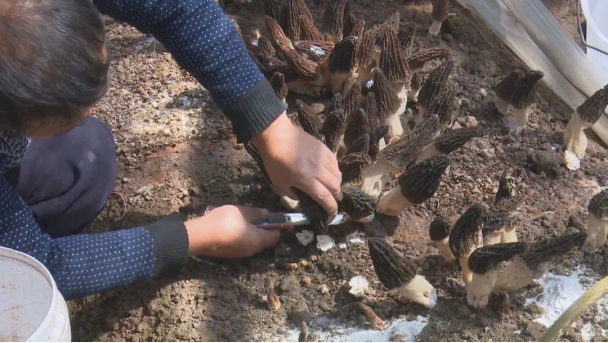 在大姚县三台乡林下羊肚菌种植示范基地,基地负责人马年侯正带领村民们采收成熟的羊肚菌。