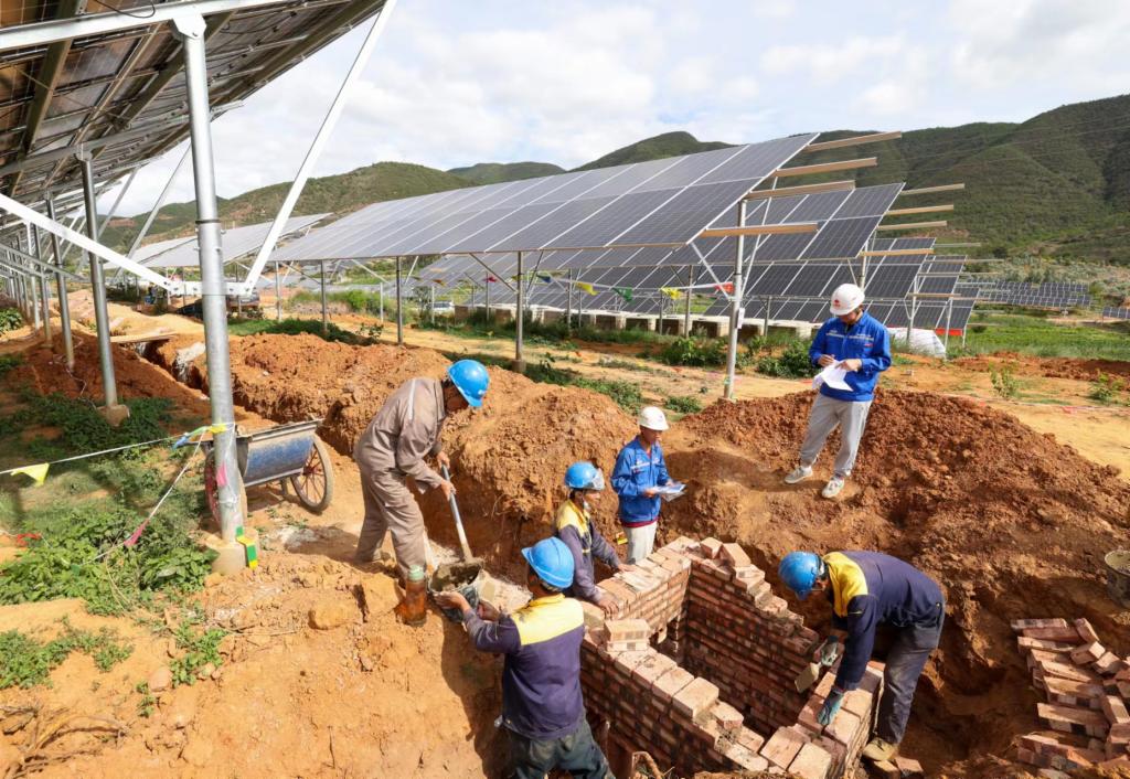 炎炎夏日,气温与日俱增,但比气温更火热的是项目建设现场。7月13日,记者来到楚雄彝族自治州大姚县龙街镇大平地光伏基地建设现场,看到一派繁忙的景象:钻孔、浇桩、光伏板组件安装、电缆沟开挖、升压站建设……数百名工人顶着烈日抓紧施工。