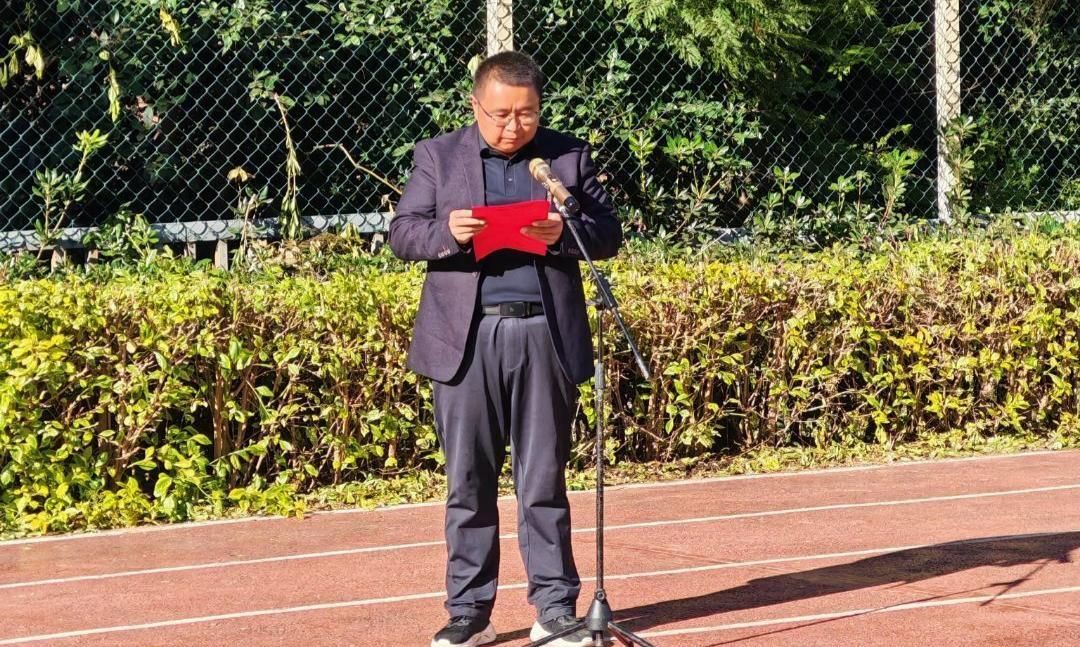全体师生齐唱国歌后,学校领导致开幕词。致辞中充分肯定了体育育人在学生成长中的重要作用,回顾了过去一年学校体育工作取得的成果,并对全体运动员、裁判员和工作人员提出期望:希望运动员们赛出风格、赛出水平;裁判员们恪守职责、公正执裁;工作人员热情服务、保障到位,共同将本届运动会办成一场“安全文明、拼搏奋进、团结和谐”的盛会。