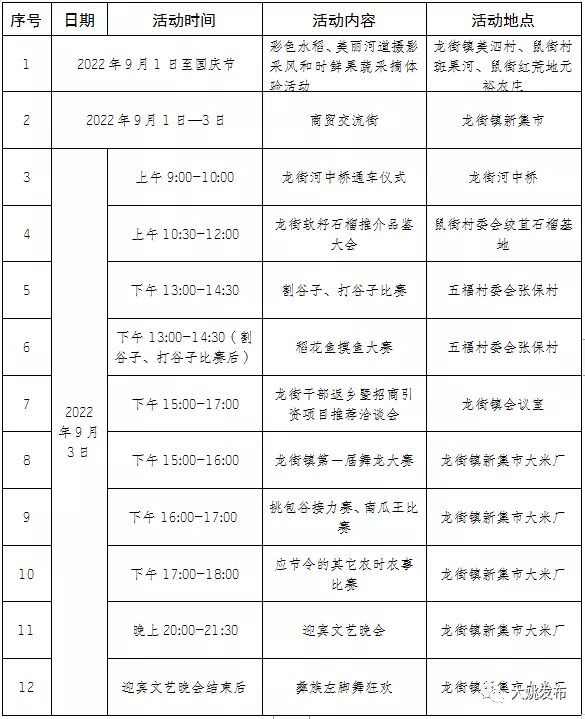 为认真落实中央农办等部门联合下发的《关于做好中国农民丰收节组织实施工作的指导意见》精神,进一步打造龙街“农业产业强镇、生态宜居乡镇、特色味稻小镇”品牌,提升全镇广大群众的获得感、幸福感和认同感,营造感党恩,喜迎党的二十大良好氛围,龙街镇将于2022年9月3日(星期六)举办“庆丰收 迎盛会”2022年龙街丰收节庆祝活动。
