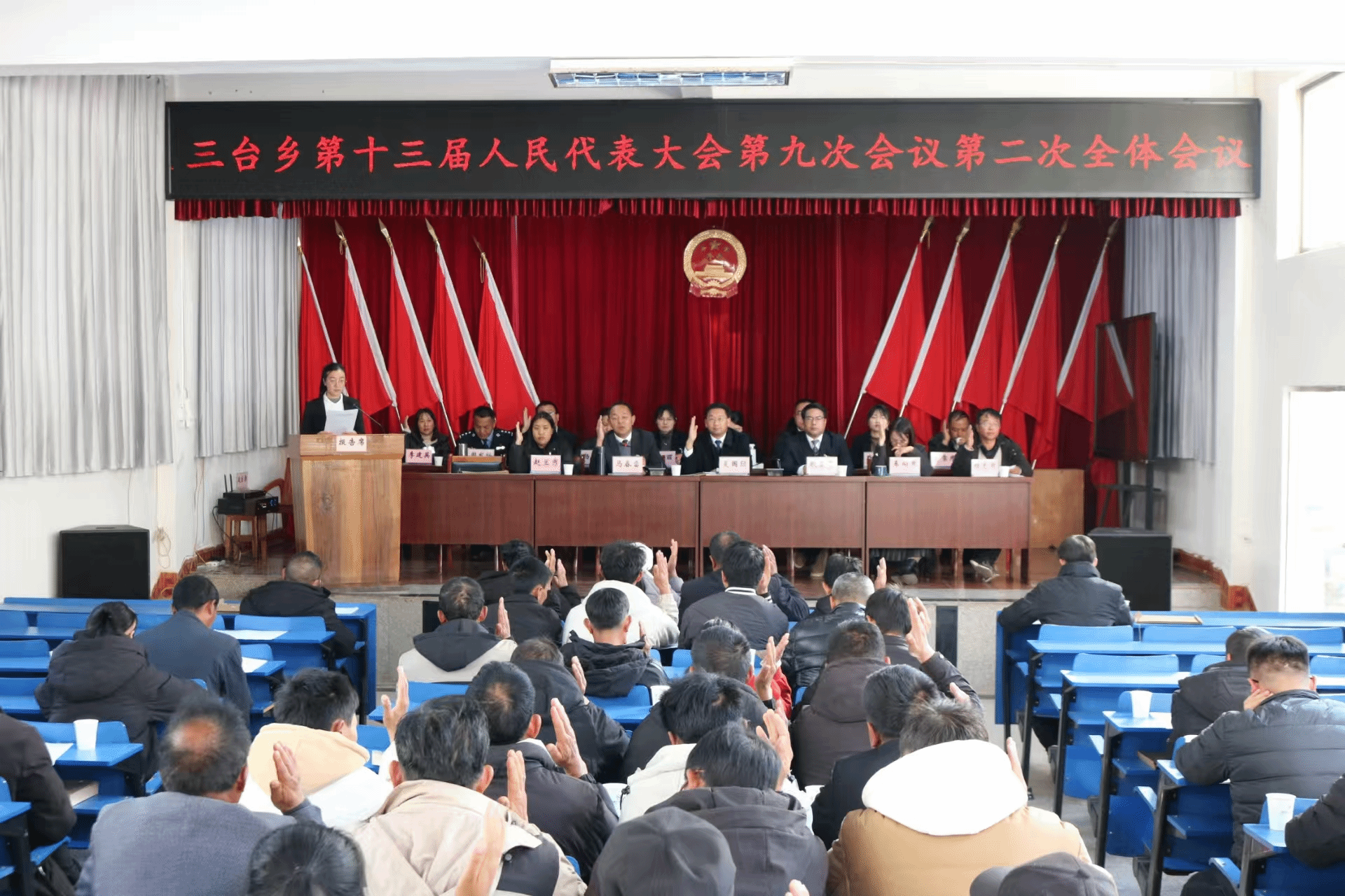 2026年1月10日,三台乡第十三届人民代表大会第九次会议胜利召开,来自乡机关、村(社区)、卫生院、学校、企业等各行业的36名人大代表和24名列席人员齐聚一堂,依法履行职责,共商发展大计,为三台经济社会高质量发展凝聚智慧和力量。