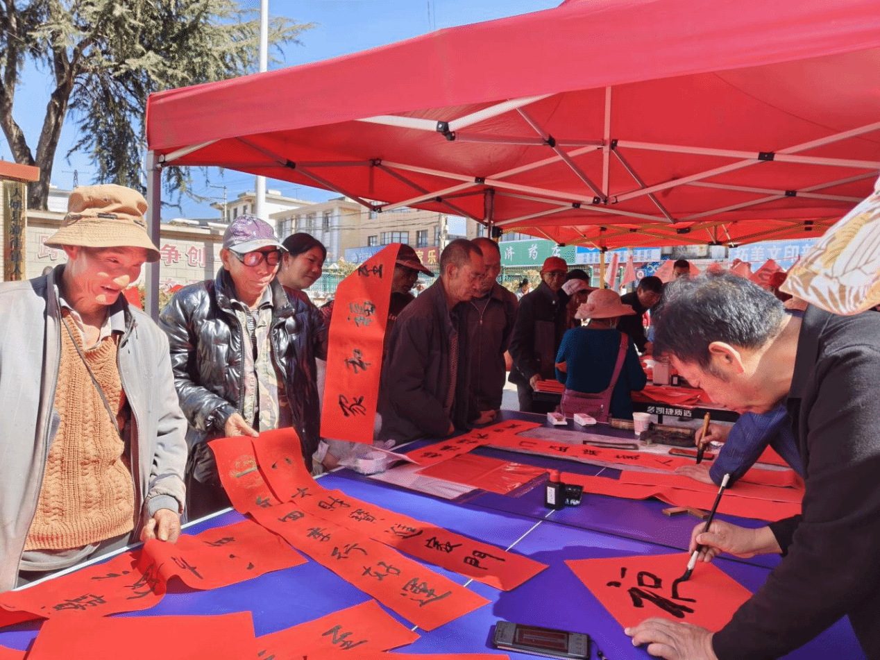 新春佳节临近,为弘扬中华优秀传统文化,营造浓厚新春喜庆氛围,1月27日,云南省楚雄彝族自治州大姚县新街镇在新时代文明实践广场开展了“送福迎新春 墨香暖人心”文明实践活动,将一幅幅满载迎新春的祝福送到群众身边。