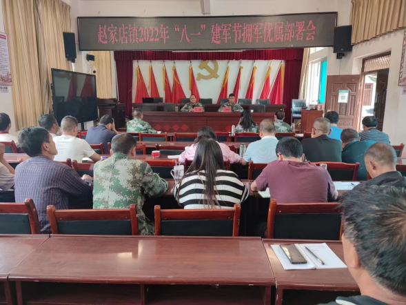 8月1日,赵家店镇组织全镇干部职工、各村(社区)书记召开了2022年“八一”建军节拥军优属部署会,会议对赵家店镇"八一"建军节期间的相关工作进行安排部署。会议要求,各中心、所站;各村(社区)要强化认识,提高政治站位,严格按照统一安排部署进行走访慰问,将党和政府的温暖送到退役军人和其他优抚对象心中;要以此次走访慰问为契机,为特殊困难退役军人排忧解难,营造拥军优属,拥政爱民的浓厚氛围;要结合实际,广泛开展座谈交流会,确保退役军人始终离军不离党、退役不褪色,充分发挥退役军人的力量,让军人成为全社会尊崇的职业,更好地服务回报社会。