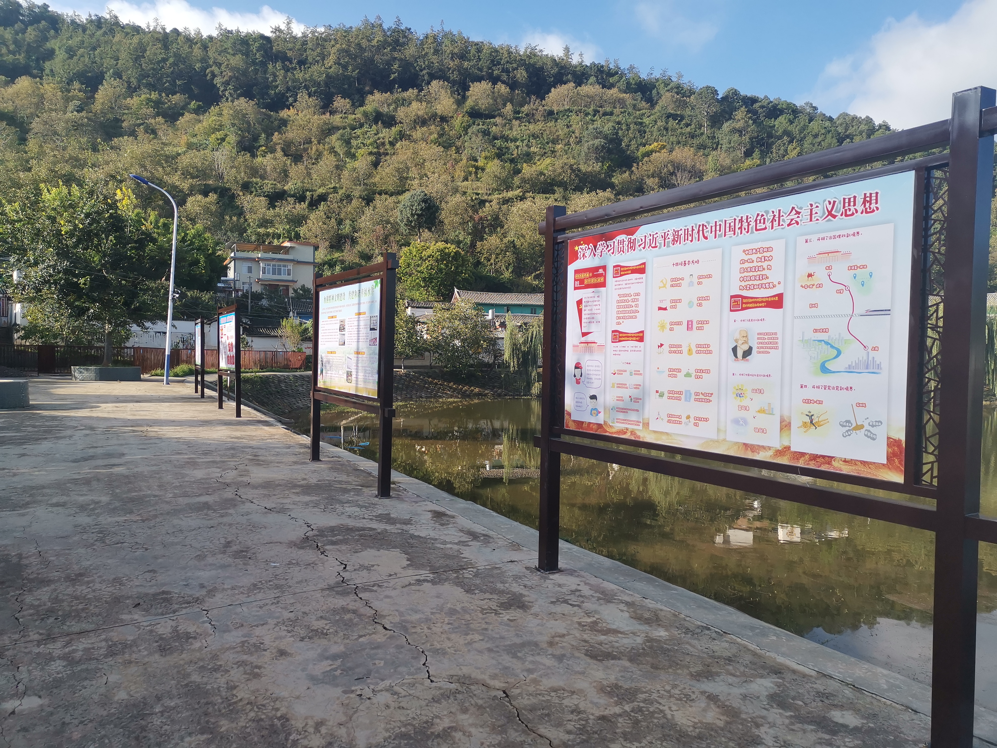 水井村是一个彝族聚居村落,位于六苴社区东南角,村内有一口历史悠久的古井,水井因此得名。水井村位居半山顶,村子正中有一个坝塘,50余户群众围水而建。坝塘正前方,建有民族团结广场,每逢妇女节、火把节等传统节日,妇孺老少便会换上彝族盛装,围圈打跳。坝塘左侧的文化长廊给彝族群众提供了学习的阵地,闲暇时节,三三两两相约一起驻足学习。坝塘右侧的党员活动室时常因“红黑榜”评比深得人心而传出激烈的掌声,灯光篮球场上青年活跃的身影交错着墙体彩绘和垂柳枝条相互映衬,仿如正在演绎皮影戏;妇女坐在坝塘边缝着鞋垫、绣着刺绣、拉拉家常,微风轻拂,不时传来几曲彝族调子,村庄一片悠然自得,俨然一副美好的画卷。