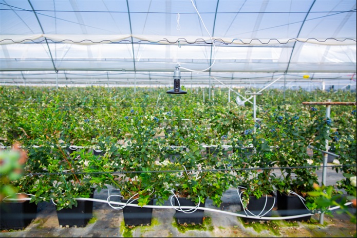据了解,蓝莓种植基地的管理过程都是数字化管理,主要通过气象数据和水源数据反馈调整蓝莓苗的进液和排液,可在手机或电脑终端上设置浇水方案,含浇水施肥的时长、频率等,时刻监测PH值和EC值。蓝莓种植基地通过先进的棚体设置和精准的水肥一体化浇灌,让水肥直达蓝莓根部,还采用无土栽培的方式,为蓝莓专门定制了椰壳、珍珠盐、泥炭等配方,保证蓝莓需要的偏酸性环境。