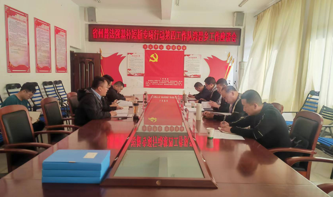走访结束后,召开了省州普法强基补短板专项行动第四工作队湾碧乡工作座谈会。会上,湾碧乡汇报了普法强基补短板专项行动开展情况,县普法第十二工作队挂点领导杨建华强调,要突出普法的精准性,摸准摸实“十类人员”;要突出普法实效性,对摸排结果进一步做好分类和细化措施、责任到人、包保到户;要突出普法针对性,对焦点问题进行针对性宣传普法;要突出普法全民参与,充分调动群众参与普法工作的积极性,营造良好氛围。