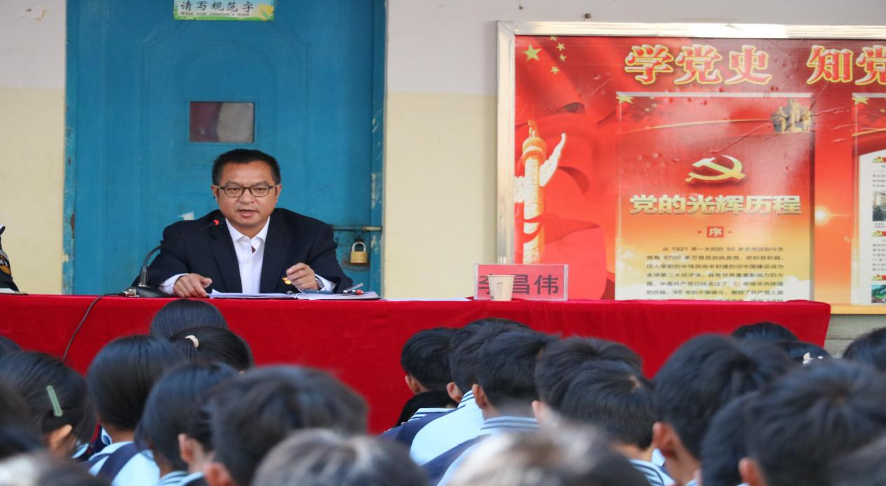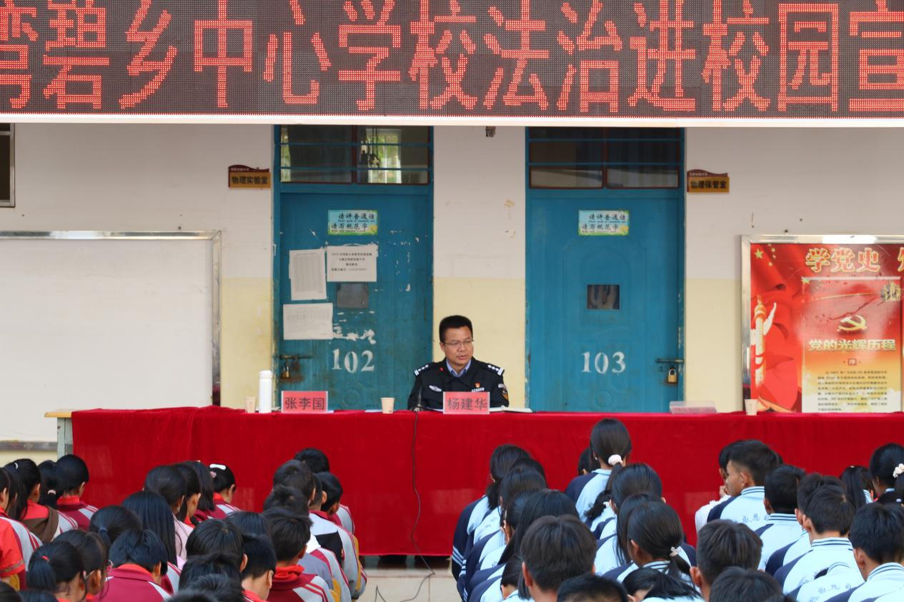 为认真贯彻落实中共大姚县委办公室、大姚县人民政府办公室印发的《大姚县2023年普法强基补短板专项行动实施方案》的通知的相关要求,切实打好“守护未来”普法攻坚战,2023年3月2日上午10时,大姚县公安局政委杨建华,湾碧乡人民政府副乡长、湾碧派出所所长张李国一行到湾碧乡中心学校,深入开展“法律进学校”活动。