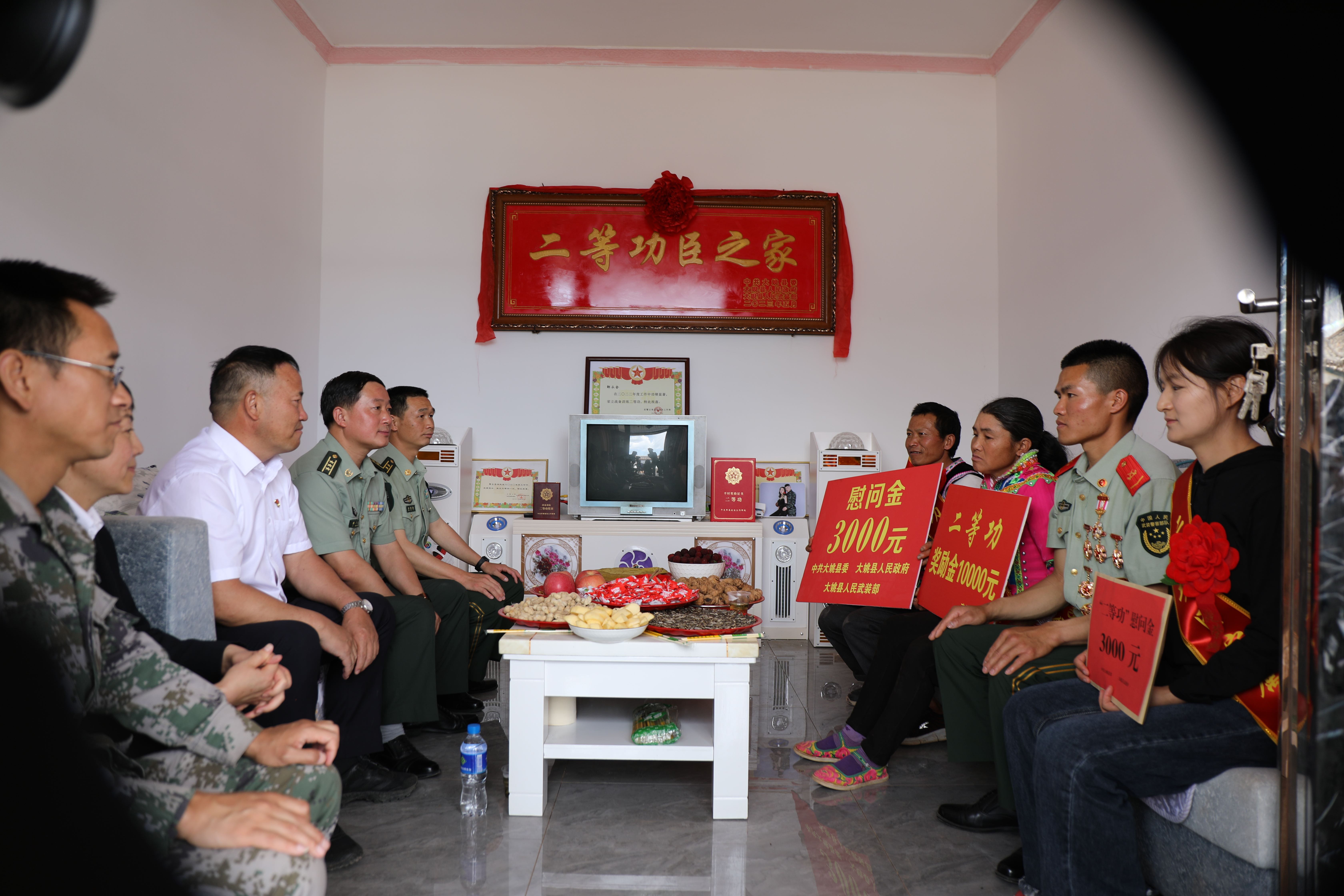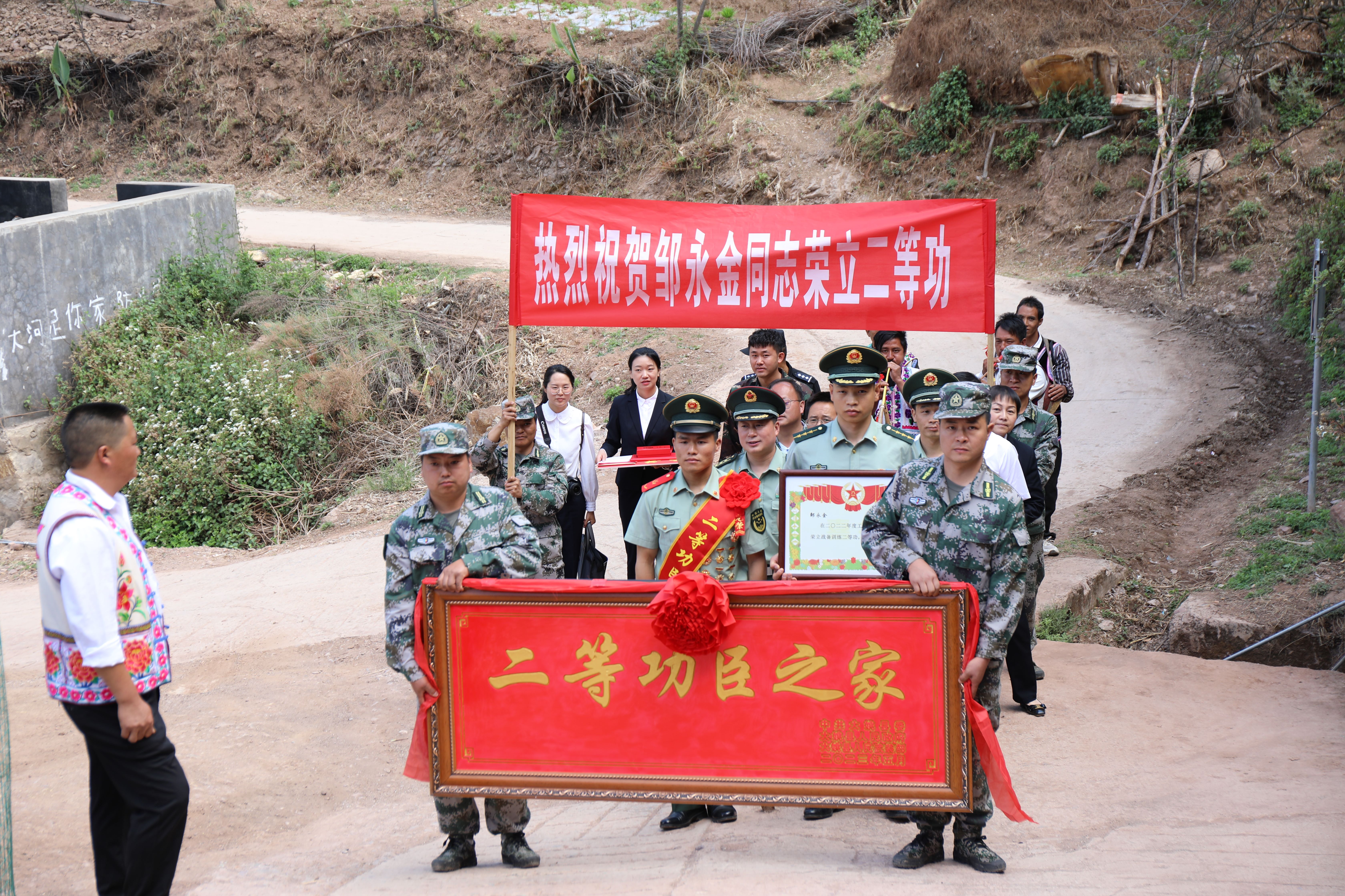 5月19日,桂花镇大河村委会猛古地二组鼓乐齐鸣一片沸腾。大姚县委常委、县人武部政委李广山、武警昭通支队中校副支队长彭贵海、大姚县人民政府副县长、县公安局局长汪福、县退役军人事务局局长李雪琴、桂花镇人民政府镇长李建华等县级领导和相关部门负责人一行来到荣立二等功的现役军人邹永金家中,将“二等功喜报”“二等功臣之家”牌匾、相关证书、证章和奖金(慰问金)颁发给邹永金及其家人,并向他们表示由衷的祝贺。