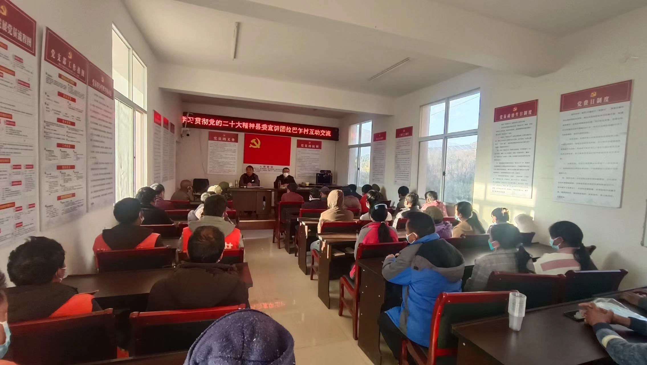 李兴明书记深入铁锁乡拉巴乍村委会,向党员干部群众专题宣讲党的二十大精神,用通俗易懂的话语、鲜活的案例,深入浅出地阐释了党的二十大的重大意义、精神实质、核心要义,并围绕党的二十大报告中关于乡村振兴、共同富裕、基层治理、社会文明等方面的内容。结合拉巴乍村情、民情、发展现状因地制宜提出:两抓手—抓产业、抓环境发展策略。 脱贫攻坚以来拉巴乍实现翻天覆地的变化,最贫困的阿谷治、汝背地等小组实现整体搬迁,现在安置点环境好、房屋美,但是从全县来看拉巴乍依然相对比较落后。需从产业和治理入手,一要久久为功大力发展种养殖业,紧盯市场实现产业特色化、市场化。二要坚持不懈抓人居环境,从村容村貌硬环境到乡风文明软环境两手抓,并且两手都要硬。