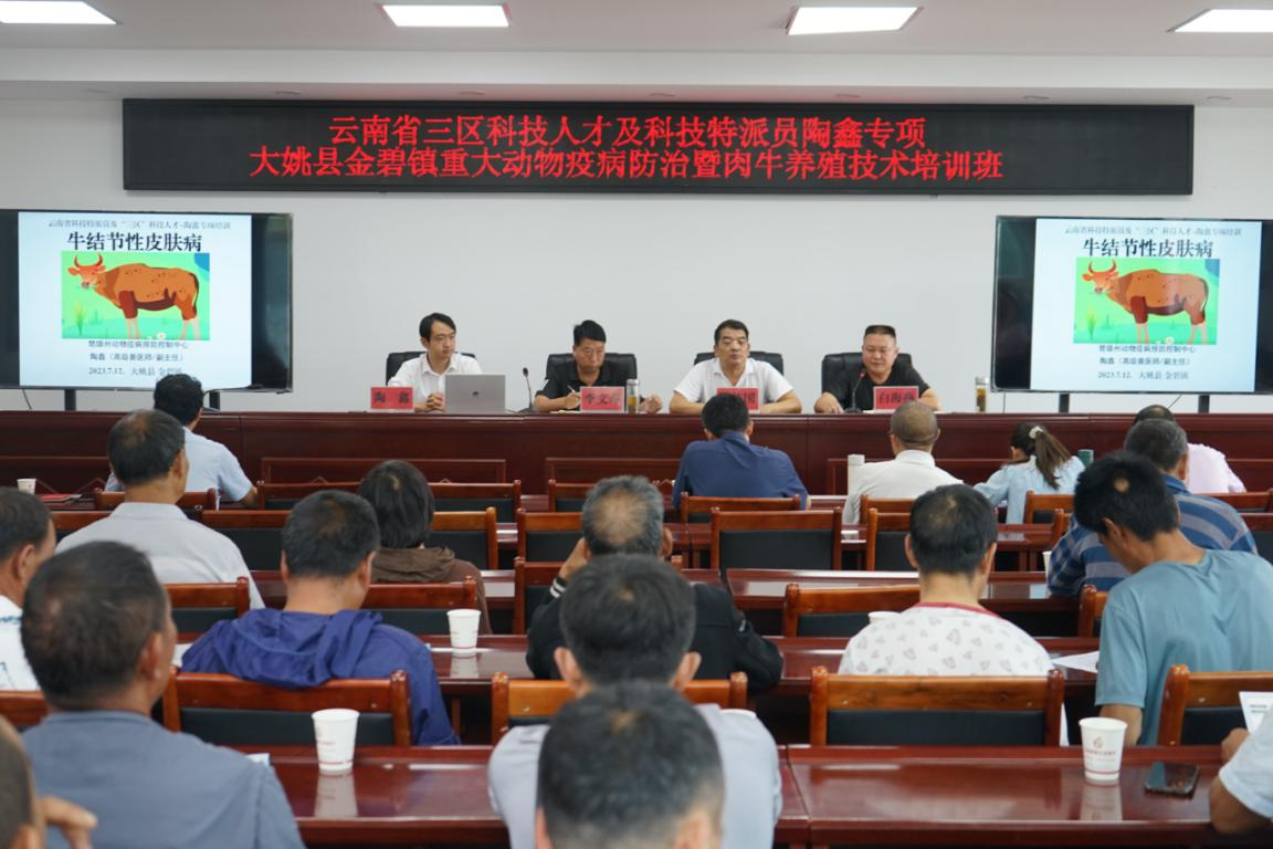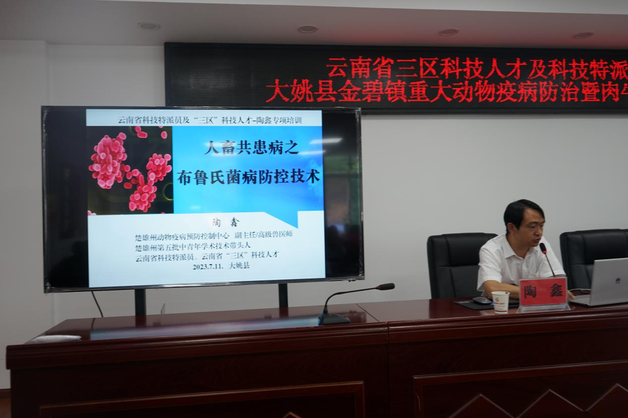 培训会上,云南省三区科技人才及科技特派员陶鑫开展重大动物疫病防治培训。主要介绍了大姚县近年来多发的牛结节性皮肤病、布鲁氏杆菌病、动物疫病净化等动物疫病防治技术。