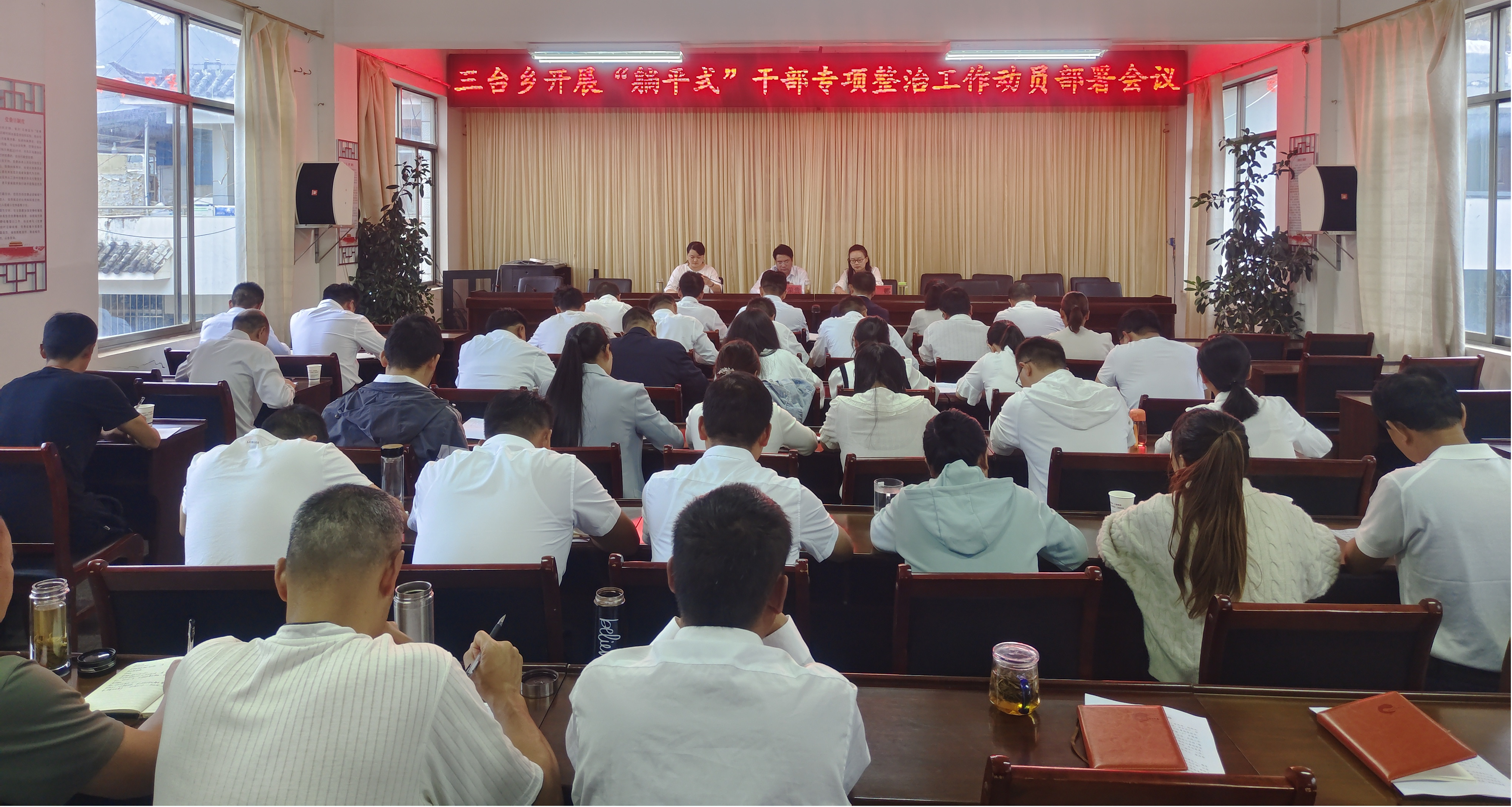8月5日上午,三台乡召开“躺平式”干部专项整治动员部署会议,主要任务是深入学习贯彻习近平新时代中国特色社会主义思想和党的二十大精神,认真贯彻落实省、州、县党委关于开展“躺平式”干部专项整治的工作要求,并对三台乡开展“躺平式”干部专项整治工作进行统一部署和安排。