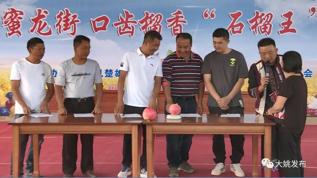 迎宾仪式结束后,在绞苴石榴基地举办的“甜蜜龙街、口齿榴香”石榴王评选大赛正式拉开丰收节的帷幕。13户石榴种植户带着精心挑选的石榴到会参赛。一个个圆润饱满的石榴在展台上整齐排列,闪耀着诱人的光芒。5名石榴种植专家组成评委会,仔细品鉴、品尝,从色泽度、成熟度、甜度等方面对参赛石榴进行测评、打分。经过层层选拔,来自宏富黑钻软籽石榴种植基地的石榴杀出重围,以1.28公斤的重量获得“石榴王”称号。