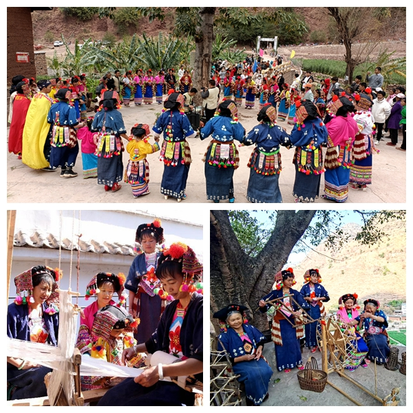(古法技艺纺线织布、各民族载歌载舞庆佳节)