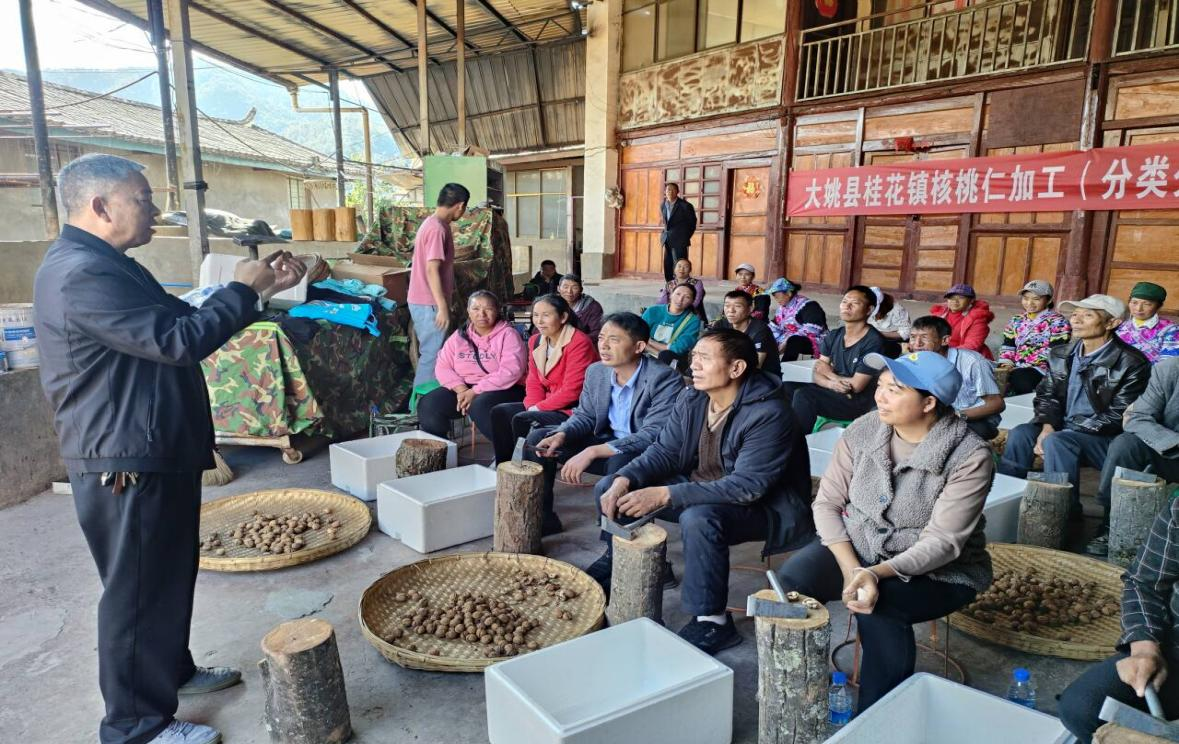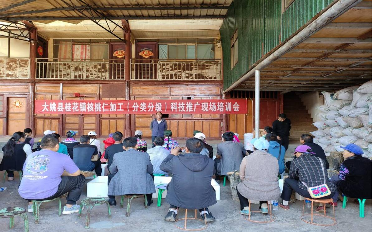 培训采取理论讲解和实地示范的方式进行。培训会上,桂花镇参会领导介绍了全镇核桃产业发展情况并就林农参与核桃仁加工作了动员;镇林草中心介绍了核桃仁加工科技推广服务项目并作相关要求;县林草局参会领导安排部署了核桃仁加工(分类分级)科技推广工作;核桃仁加工企业技术人员现场组织了现场实作培训,围绕如何加工出质量好的核桃仁进行讲解,重点对种植户在核桃仁加工(分类分级)方面的难题进行了现场指导和经验分享。
