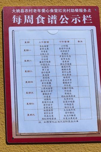 公开公示制度,吃得顺心。爱心食堂运营坚持公开、透明,接受社会广泛监督,管委会组成人员、每周食谱、财务收支、物资抵扣、食堂工作人员及健康状况等逐一进行了公示。同时,市场监管所每月对爱心食堂进行一次检查,并将检查结果和整改情况进行公开。公生明,廉生威,通过公开公示逐步建立群众对爱心食堂的信任。