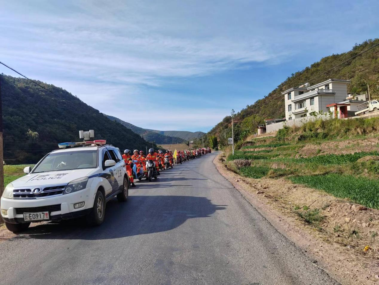 仪式结束后,武装巡护队伍从镇人民政府出发,至团山水库结束,途经龙街社区、仓屯、五福村委会。全体护林员身着防火马甲、车队插防火彩旗、全程播放护林防火“小喇叭”,龙街镇武装部部长、派出所干警、林业和草原服务中心全体人员、综合应急救援队、护林员共计75人参加了武装巡护。