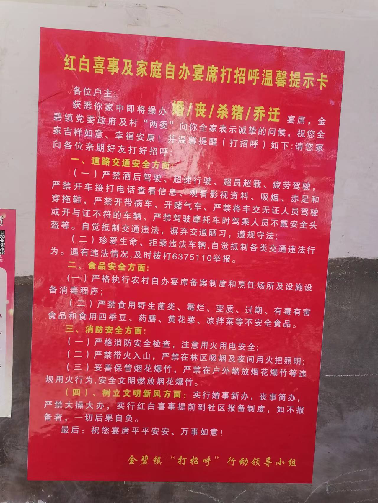 四是突出重点整治。临近年底农闲时节,农村婚/丧/杀猪/乔迁自办宴席增多,随之安全隐患增加,金碧镇“打招呼”行动领导小组采取亲民易理解的“打招呼”方式,通过各村小广播播放、小组粘贴“红白喜事及家庭自办宴席打招呼温馨提示卡”,将道路交通安全、食品安全、消防安全全方位宣传,增强广大人民群众安全意识,树立新时代文明新风尚。
