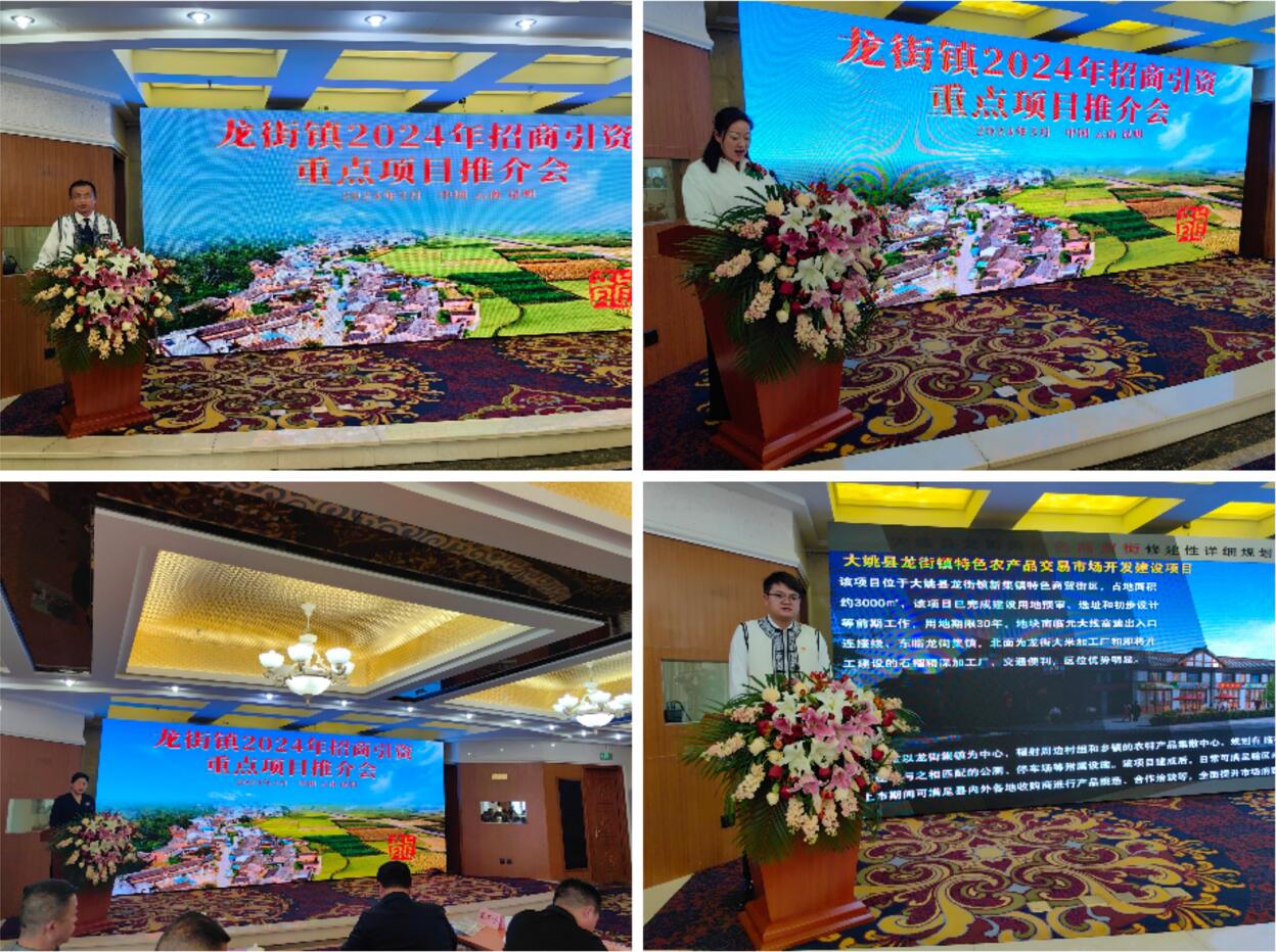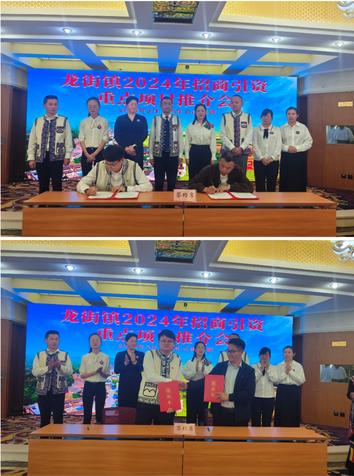 推介会上,参会人员观看了大姚县及龙街镇招商引资宣传片,龙街镇党委书记张钰霖同志致辞,并围绕龙街镇区位优势、产业基础、营商环境三方面做了详细的介绍,镇人民政府分管招商引资的同志对重点招商引资项目进行推介,县级部门相关领导就招商引资政策作解读,并对大姚县的优势,以及投资内容做了详细介绍,企业家代表也作了讲话。随后,龙街镇人民政府与楚雄回归农业科技发展有限公司、楚雄州富彝种业集团有限公司、大姚县福鑫农业科技有限公司、名创蓝莓有限公司、大唐(大姚)新能源开发有限公司进行现场签约。