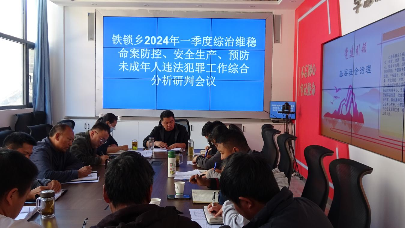 为全面分析研判全乡2024年一季度安全稳定形势,研究防范化解应对处置工作举措,确保全乡社会大局平安稳定,3月23日,铁锁乡组织召开2024年一季度综治维稳、命案防控、安全生产、预防未成年人违法犯罪等重点工作分析研判会议。会议由乡党委副书记、政法委员杜建春主持召开,分管安全生产的副乡长、铁锁派出所所长、铁锁司法所所长、乡综治办、安监站、应急办、交通运输管理所有关负责人、各村(社区)书记、主任参加会议。