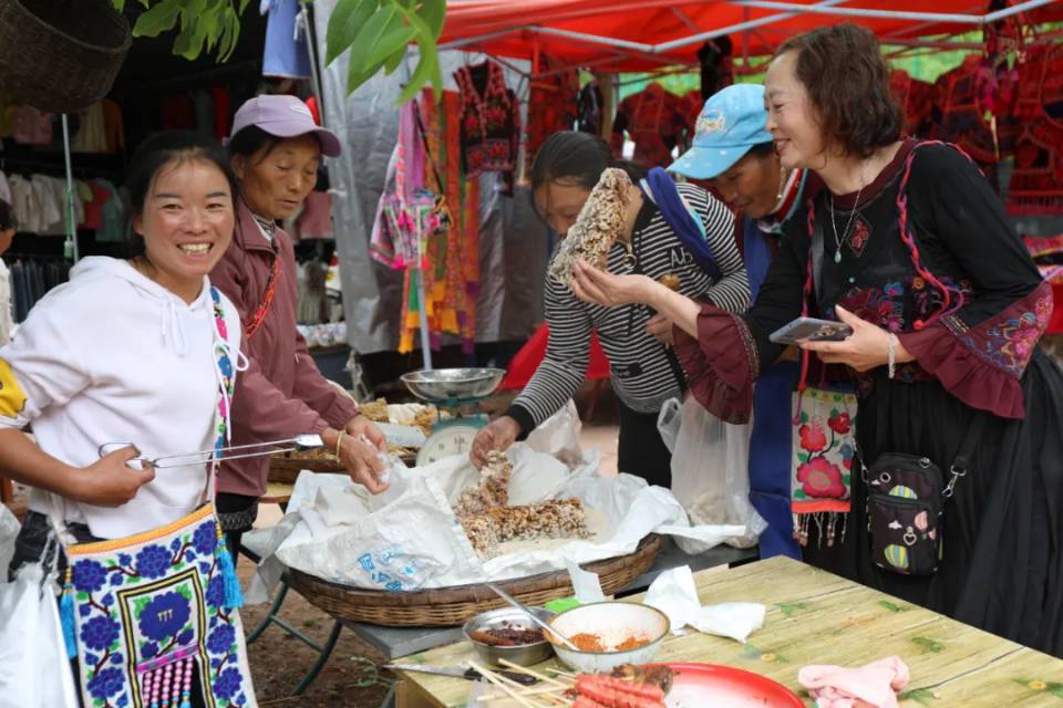 在桂花社区自必苴农特产品展销区,来自桂花的七月菊、土蜂蜜、紫衣核桃、农家火腿等特色农产品引来群众驻足购买;在彝家特色美食街,黄灿灿、香喷喷、冒着热气的苦荞粑粑新鲜出炉,不少游客群众在摊子前品尝,由于独特的口感,苦荞粑粑成为此次美食街的“最红美食”;在彝绣服饰展区,可穿、可挂、可摆的桂花特色彝族手工精美刺绣服饰产品装点着热闹的街道,具有彝族特色的小饰品吸引了不少外地年轻游客购买。“通过此次活动的开展,出售绣品收入达到1万余元,像挂饰、手链这样的小饰品特别畅销,在宣传彝绣技艺的同时,增加了我们的收入。”绣娘李雄琼说道。此次商贸交流活动既为当地群众提供了展销平台,更让游客购买到了优质、实惠的农特产品,在丰富群众精神文化生活同时有效活跃商贸物流,进一步激发乡村经济活力。