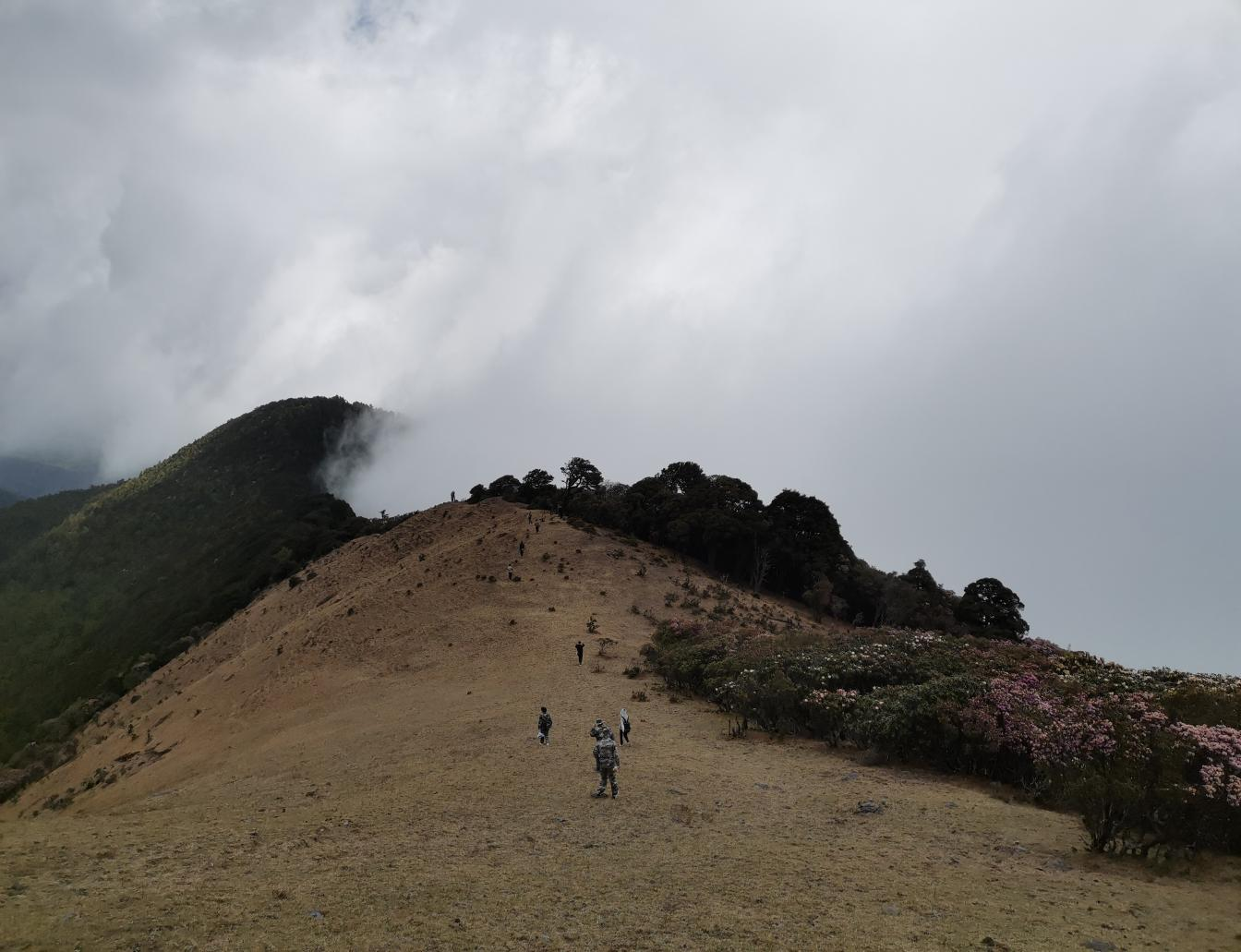 行至峰顶后,全体成员迎着凛冽的寒风“一览众山小”,共同领略了峰顶雾海苍茫、花草丰茂的大自然鬼斧神工,深切感悟“道阻且长,行则将至”的奋进精神。稍作休息后,全体成员在飘扬的党旗下拍照留念后徐徐下山。