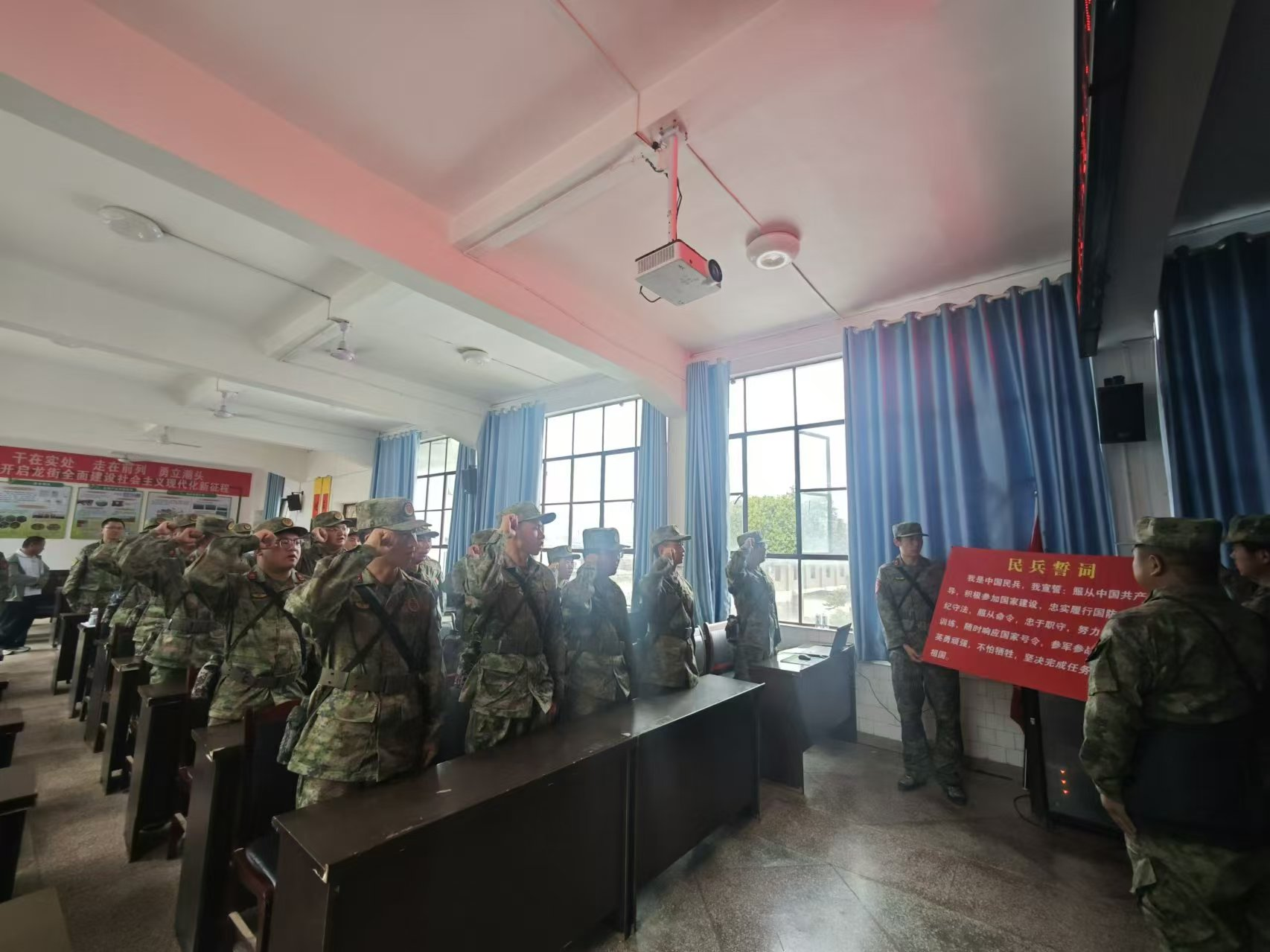 会议在雄壮而嘹亮的《中国人民解放军军歌》拉开帷幕,全体基干民兵统一身着21式迷彩作训服,以饱满的精神、高昂的士气郑重接受点验。会议宣读了民兵骨干任职命令、出入队名单,组织民兵宣誓,新入队民兵代表作表态发言,会上对龙街派出所等3个2023年度民兵先进单位,翟晓敏同志等6位优秀先进个人进行了表彰。