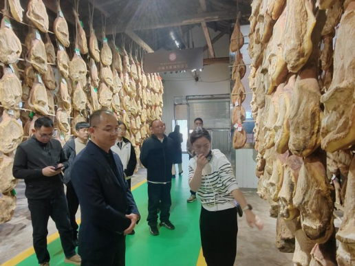 在云南宣威升达火腿食品集团有限责任公司,考察组学习了火腿制作工艺。考察组成员讨论到,六苴镇的藏香猪养殖特色产业已逐步稳定,制作藏香猪小火腿市场大有可为。