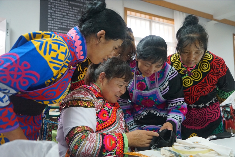 赵开芹是妇女群体中的杰出典范。她充分发挥自身影响力,积极凝聚妇女力量,累计培训来自各地的彝绣绣娘近400名,带动50余名残疾妇女投身刺绣工作,引领60多名绣娘参与彝绣产业,个人长期带徒超40余人。塔底村民周翠秀感慨道:“赵老师积极组织我们学习刺绣,耐心传授绣花、剪花、画花及针法走向等技术要领,毫无保留地分享创作经验。”在赵开芹的引领下,众多妇女拿起绣针,找到了新的人生方向,家庭收入也显著增加,每年人均增收3.6万元。大家在刺绣过程中相互交流学习,氛围良好,精神面貌焕然一新。