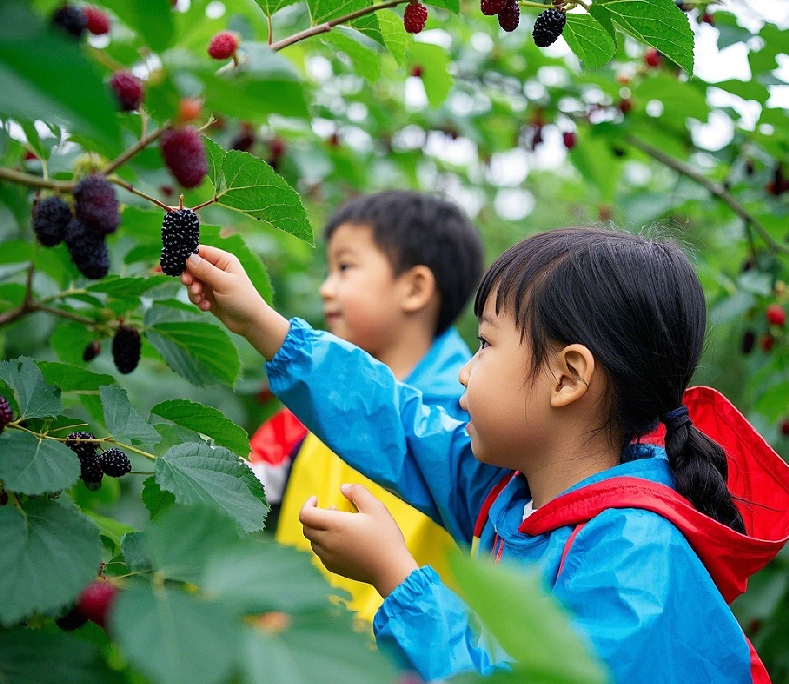 石羊镇的春天,是从桑芽初绽开始的。当春风拂过香水河畔,1.7万亩桑田次第吐绿,层层叠叠的桑叶如绿浪翻涌,与远处的孔庙飞檐、香水河波光相映成趣。漫步桑林间,孩童追逐着桑枝间跳跃的光斑,戴上草帽,提着竹篮,穿梭在桑树林中,精心挑选最鲜嫩的桑叶。指尖轻轻触碰桑叶,那细腻柔软的触感,仿佛是春天在与你握手。采摘下来的桑叶,是蚕宝宝们最喜爱的美食。当你把桑叶投喂给蚕宝宝时,看着它们欢快地咀嚼,发出沙沙的声响,你能真切感受到生命的奇妙与成长。每年4月桑葚成熟季,紫如宝石的桑葚挂满枝头,游客可体验采摘乐趣,亲手制作桑葚果酱、桑果酒,将春日甜蜜封存在罐中。