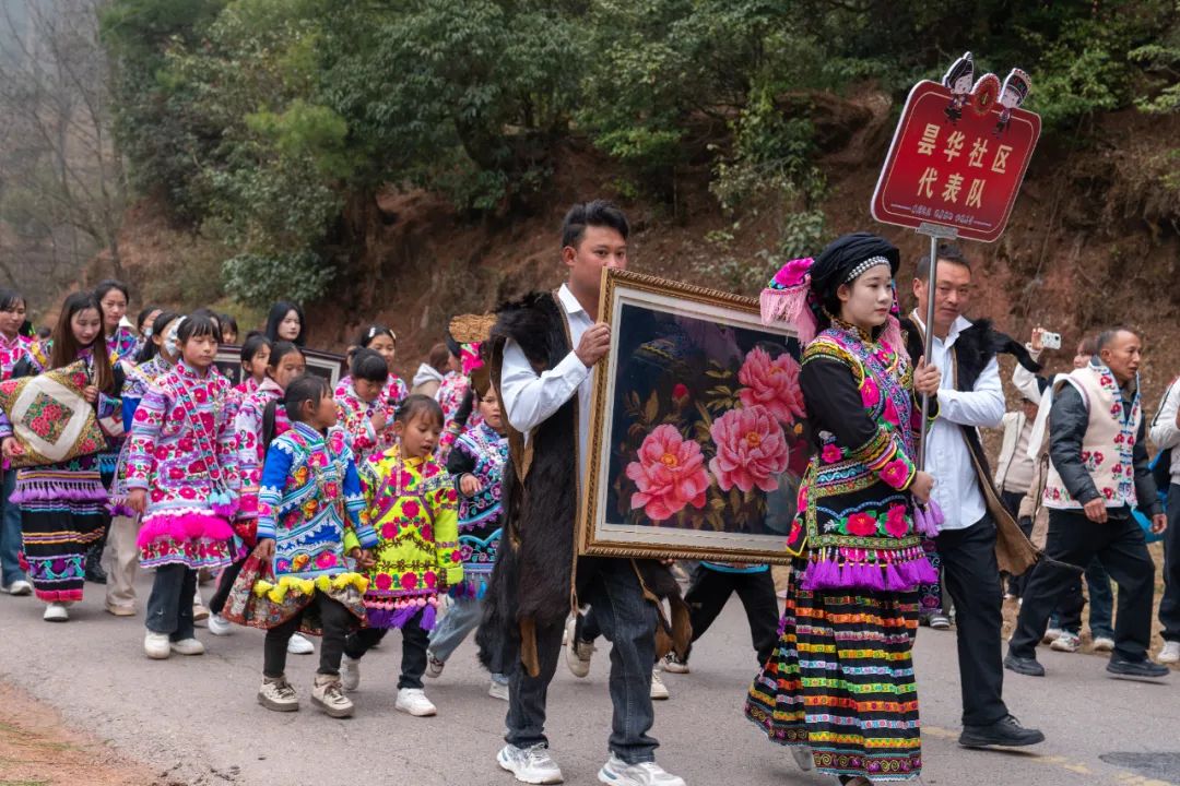非遗巡游队伍沿山道蜿蜒成一条流动的文化血脉,它以绚丽多姿的形式,为插花节注入了更为浓郁的节日气息,瞬间点燃了现场的热烈氛围。这场穿行于山间的活态展演,不仅以“行走的非遗课堂”之名激活了昙华乡的节庆基因,更通过绣娘指尖的彝纹图腾、毕摩吟诵的古老梅葛,为八方来客揭开“世界级特色节庆”的神秘面纱。