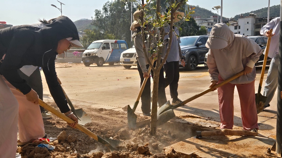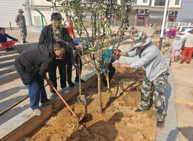 植树现场,全体人员热情高涨,干劲十足,分工协作,铲土造坑、扶苗填坑、提水浇灌,各个环节衔接有序、配合默契。在大家共同努力下,一株株树苗整齐排列、迎风挺立,形成一道“党建红”与“生态绿”交织的亮丽风景线,为龙街新集镇的建设缀上了点点新绿,为大地增添了勃勃生机。