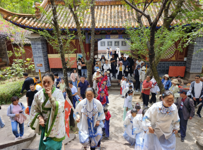 “一拜自强不息,二拜厚德载物!”5月1日上午,来自昆明、楚雄、攀枝花等地的300余名传统文化爱好者齐聚大成殿,通过献帛、献爵、恭读祭文等传统礼仪,感悟儒家文化精髓。身着汉服的研学团队穿梭于棂星门、朱子阁间,在“滇中儒学活化石”的浸润中完成文化寻根之旅。“孩子把‘状元及第’拓片装裱带回家,这是最好的成长礼物”。攀枝花游客周女士展示着特别定制的金榜题名卷轴。