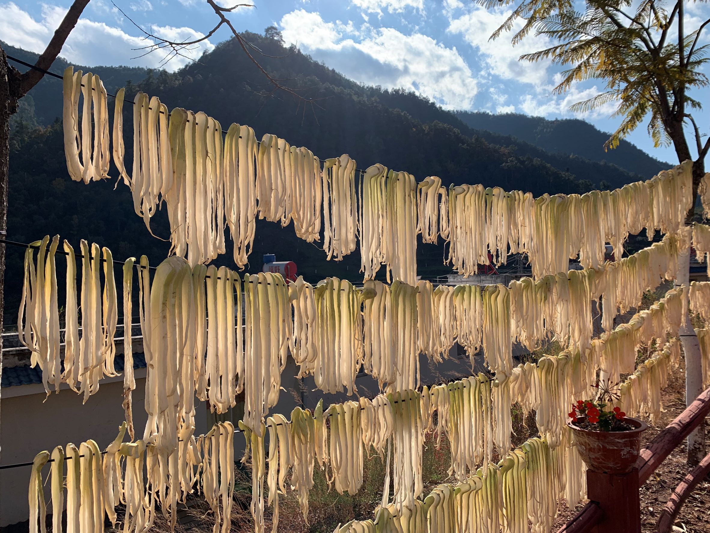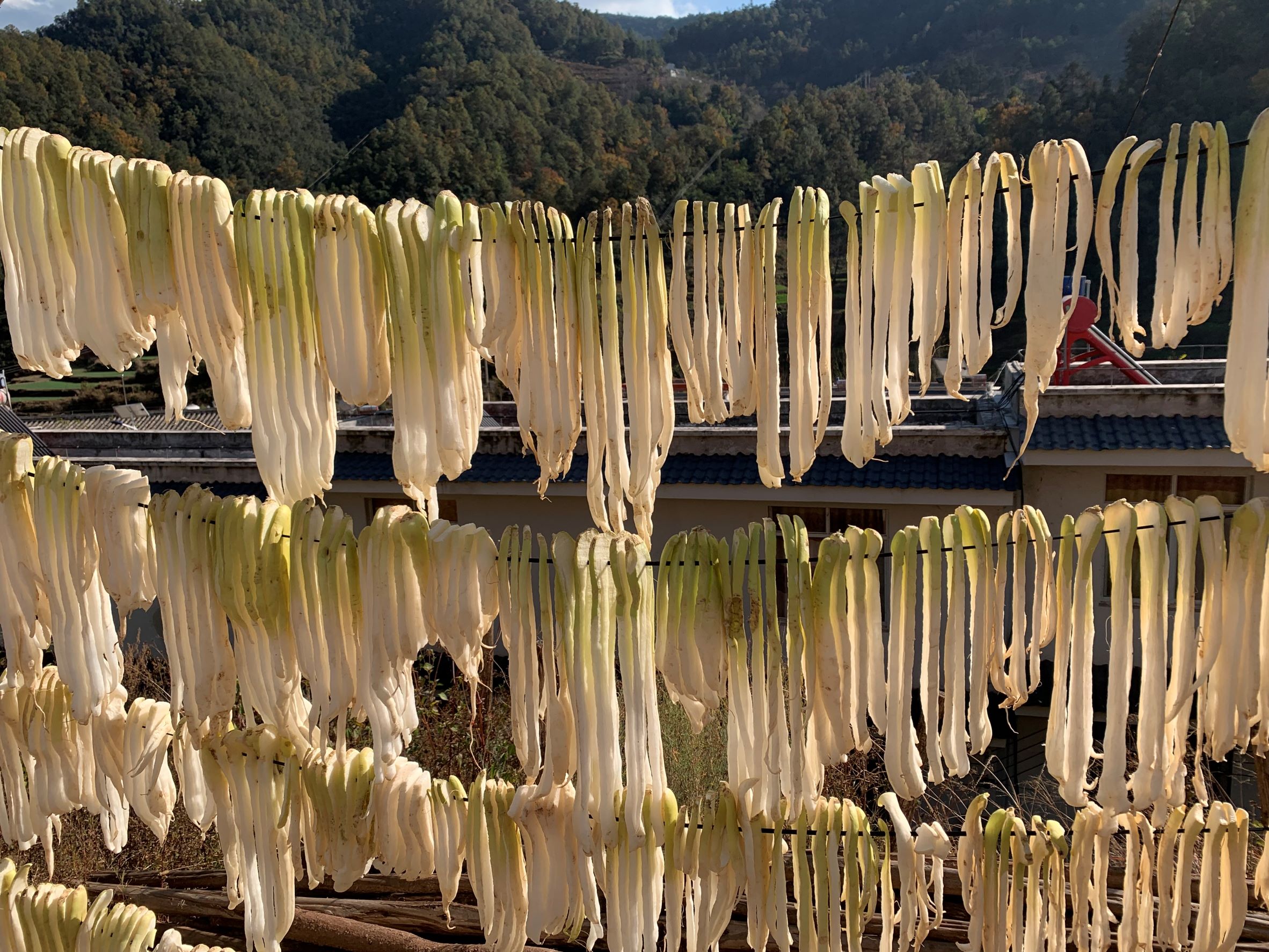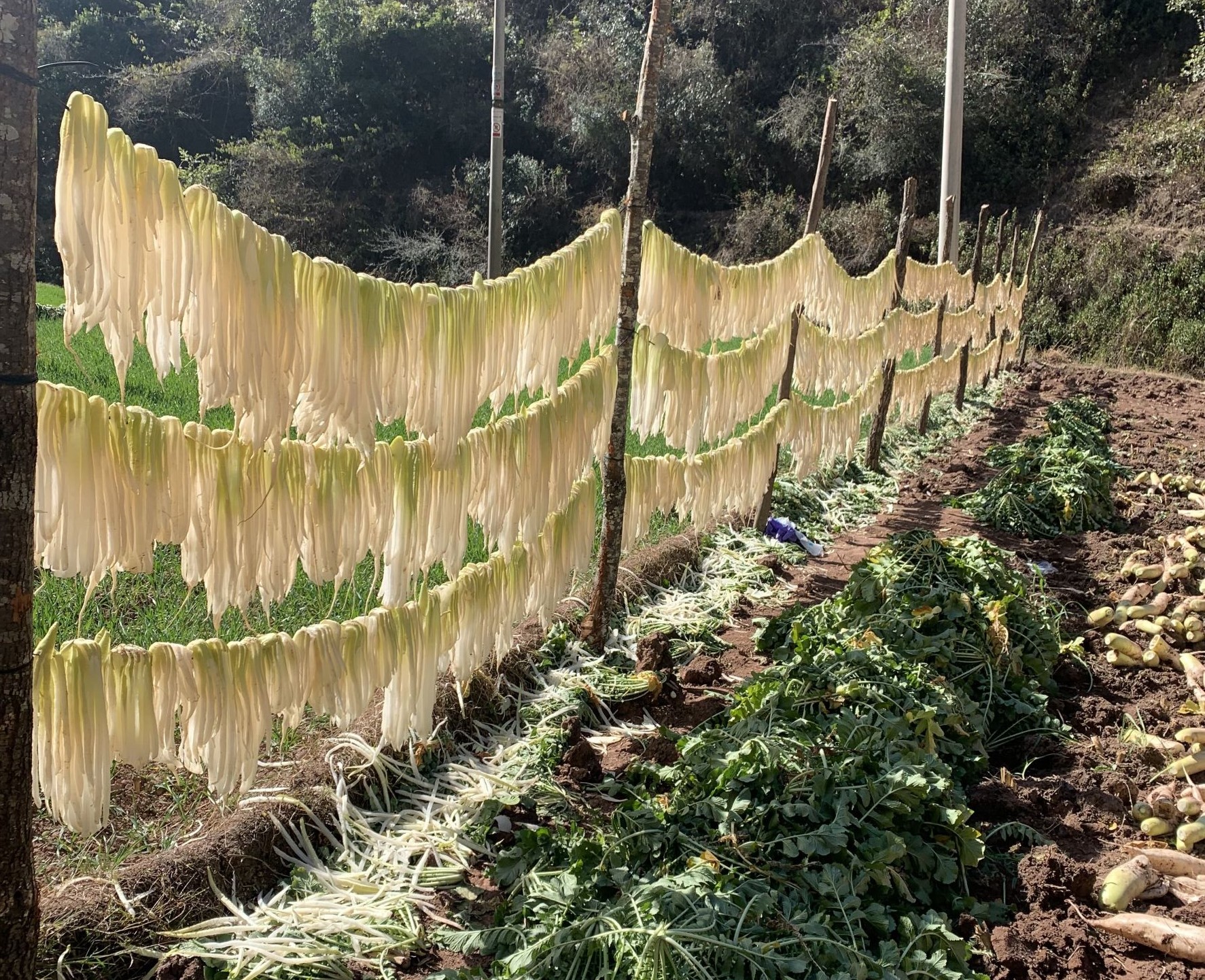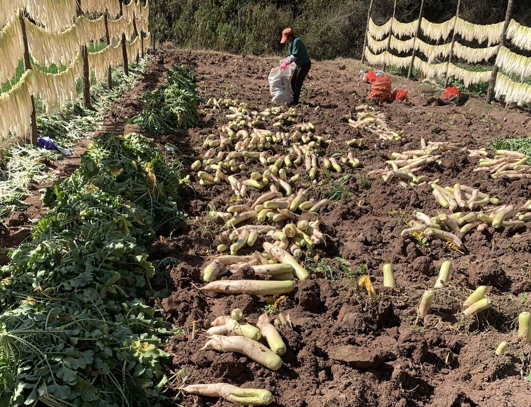 12月,待农户忙完秋收,萝卜已经奋力露出一截粗壮、水灵的“脖子”,等待被从土里拔出。挑选一个朗朗晴天,拔萝卜、洗萝卜、擦条、晾晒,老人小孩齐出动,清晨还是一片绿油油,下午就是白晃晃一副帷幔。4天后,萝卜干而不硬,收拢进袋装车,余春贵就载着萝卜种植户的希望运到昆明厂里出售。