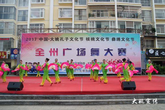 9月28日下午, 2017’中国•大姚孔子文化节•核桃文化节•彝绣文化节全州广场舞大赛决赛在金碧广场举行,尽管烈日当头,但大家兴致不减,来自全州的13家参赛代表队热情洋溢地为前来观看的群众表演了《歌唱祖国》《彝家米酒敬亲朋》《江南行》等节目,经过决赛,楚雄市茉莉花艺术团表演的《江南行》获得一等奖;大姚鑫星健身舞队表演的《有一个美丽的地方》、大姚县老年大学表演的《山姑娘》获得二等奖;姚安县富康热舞团、大姚县里长堡社区文艺协会、南华县代表队、姚安县农民戏剧家协会、大姚快乐飞扬舞蹈队表演的节目获得三等奖。县委副书记、县驻村扶贫工作队总队长纳灿辉致辞并为获奖代表队颁奖,县级领导张家卿、李雪梅出席活动。