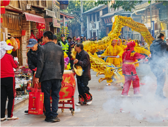 清晨,古镇在爆竹声与锣鼓声中苏醒。两条长达数十米的彩龙依次从南关外翻腾至西关外,舞龙者身着传统黄衣红绸,龙身蜿蜒起伏,龙首威严灵动,他们手持彩龙,步伐矫健,将“游龙”“钻龙身”等动作演绎得行云流水。两支由石羊社区、岔河村组成的队伍,以刚劲舞姿祈求风调雨顺、仓廪丰实,龙目所至,尽是百姓对美好年景的殷殷期盼。舞龙队伍穿梭于青砖素瓦的古镇街巷,时而腾跃翻飞,时而盘桓低舞,与人群的欢呼声、爆竹的脆响交织成一片欢腾的海洋。与此同时,孔子文化广场上,多支村级文艺队、老年协会队轮番登台,彝族左脚舞、彝族小调演唱等节目接连上演,舞步欢快、歌声悠扬,游客与本地居民手挽手加入舞蹈,共绘民族团结的生动图景。