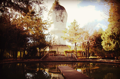 高18.4米,顶部为圆锥形,腰部收缩,上大下小似磬锤,又名磬锤塔。塔分为3层,露出地面的基座是八角形的须弥座,此塔塔身全用石灰抹白,故名白塔。白塔建于746年,为我国唐代建筑之一,相传为唐天宝年间吐蕃所建。白塔历史上曾经历过数次地震,仍安然屹立。1982年,省政府拨经费重修,恢复了白塔的本来面貌。白塔在云南仅此1座, 是云南早期舍利塔的实物例证,为第一批省级重点文物保护单位。
