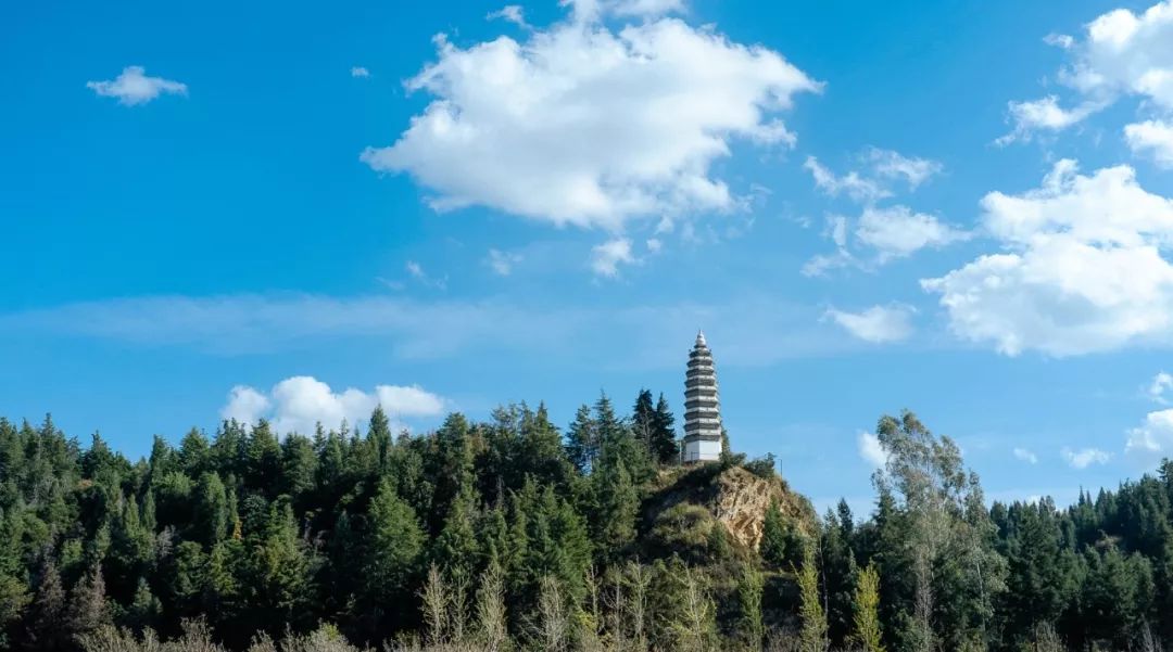 大姚白塔位于大姚县城西500米的宝筏山文笔峰顶,据道光《云南通志》记载:“白塔建于唐时,西域番僧所造。”整座塔高18.4米,由须弥座塔基、八角形塔身和纺锤体塔顶三部分组成,顶部呈圆椎形,塔身敷粉,在蓝天白云下,晶莹如雪。
