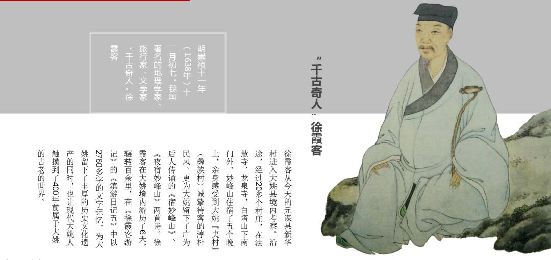 明崇祯十一年(1638年)十二月初七,我国著名的地理学家、旅行家、文学家“千古奇人”徐霞客从今天的元谋县新华村进入大姚县境内考察。沿途,经过20多个村庄,在法慧寺、龙泉寺,白塔山下南门外、妙峰山住宿了五个晚上,感受到大姚“夷村”(彝族村)诚挚待客的淳朴民风,更为大姚留下了广为后人传诵的《宿妙峰山》《夜宿妙峰山》两首诗。徐霞客在大姚境内游历了6天,辗转百余里,在《徐霞客游记》的《滇游日记五》中以2760多字的文字记忆,为大姚留下丰厚历史文化遗产的同时,也让现代大姚人触摸到了400年前属于大姚的古老的世界。