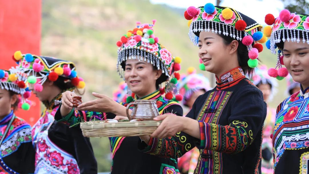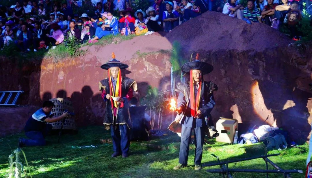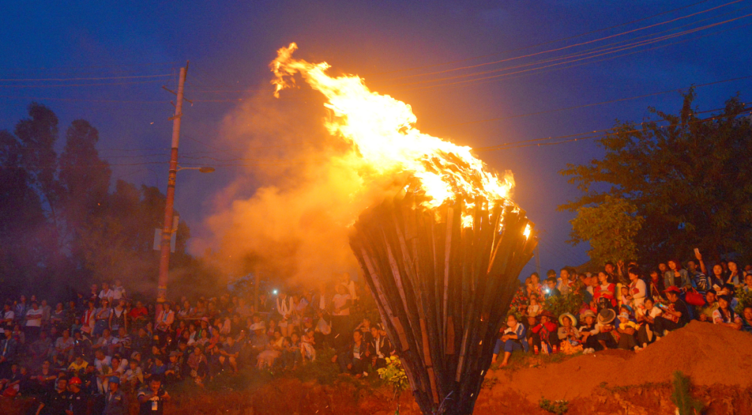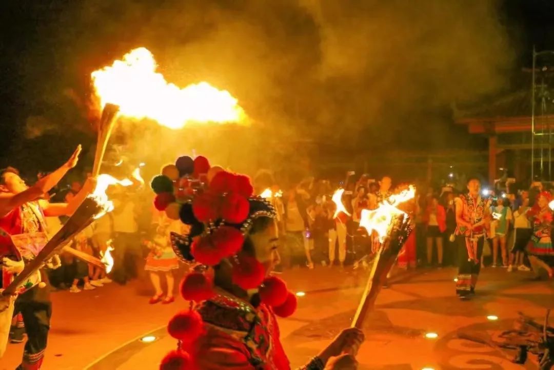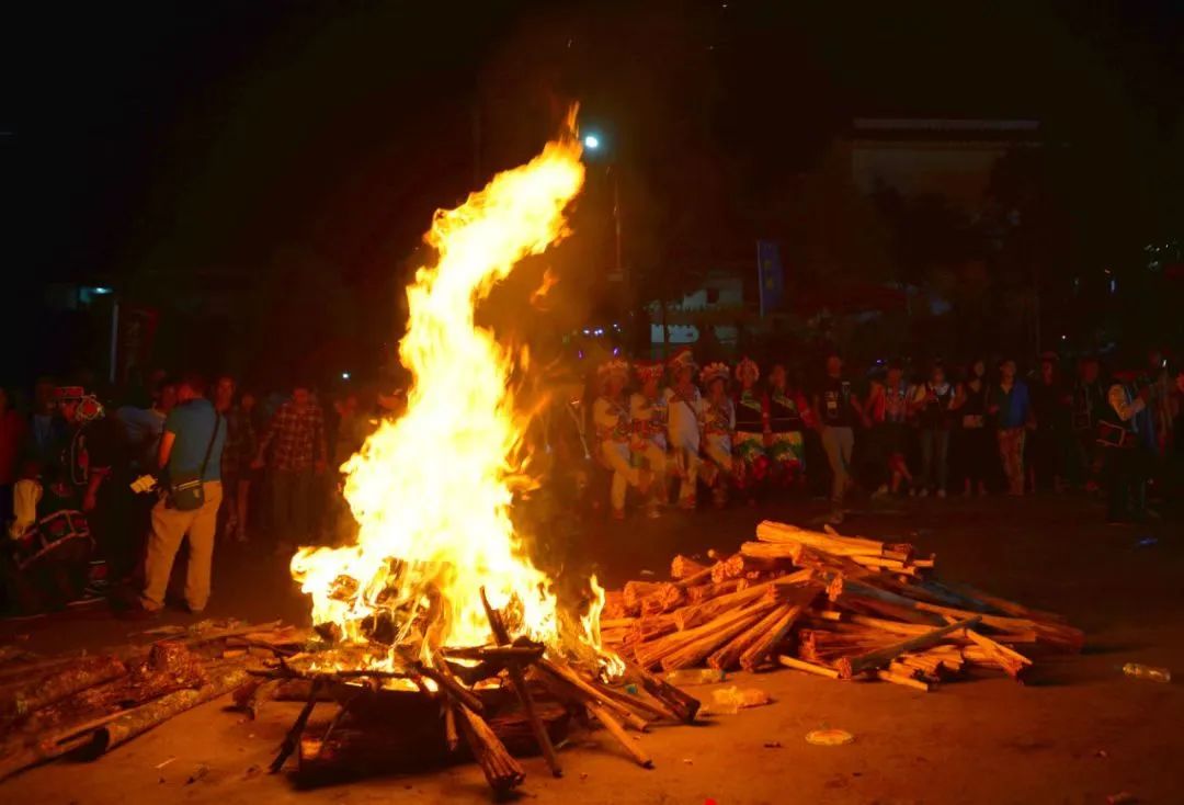 然后再举着火把到田间地头,挥舞引蛾,扑灭害虫。巡游之后,将火把插在田头地角,村前开阔地带,然后男女青年就围着火把跳起欢快的“左脚舞”,老人们则围着坐在火塘旁边,打开醇香的米酒,互相敬酒,互祝吉祥。这里的人们,还兴早早将出嫁的女儿接回家来。节日这天,杀猪宰羊,同吃同住,以示亲人团聚,这古老的习俗也就一直沿袭至今。