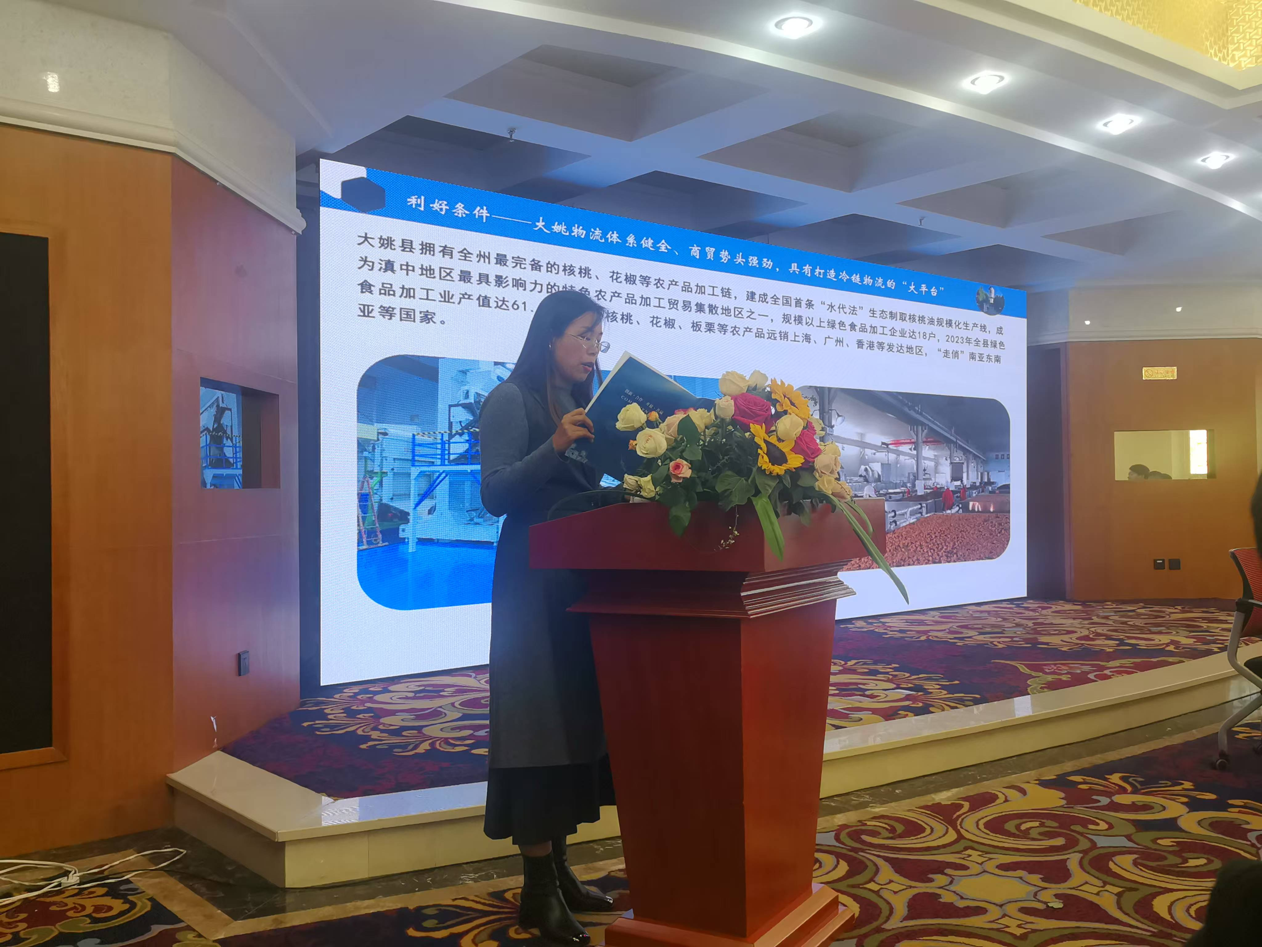县委常委、常务副县长杨晓丽围绕大姚县“历史悠久、资源丰富、民风浓郁、人杰地灵、生态良好、区位优越、发展势头强劲”的县情;大姚冷链物流发展情况及发展冷链物流产业“地缘优势明显、交通枢纽完善;农业基础雄厚、产业特色鲜明;流体系健全、商贸势头强劲”的利好条件作介绍,并向企业家们推介大姚冷链物流中心建设项目等6个与冷链物流关联性较大、成熟度较高的招商引资项目。