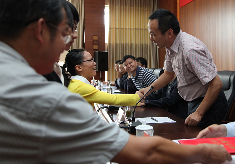 2015年10月13日县委书记陆积峰(左三)到基金会调研指导工作 |